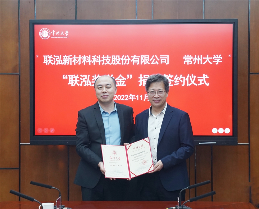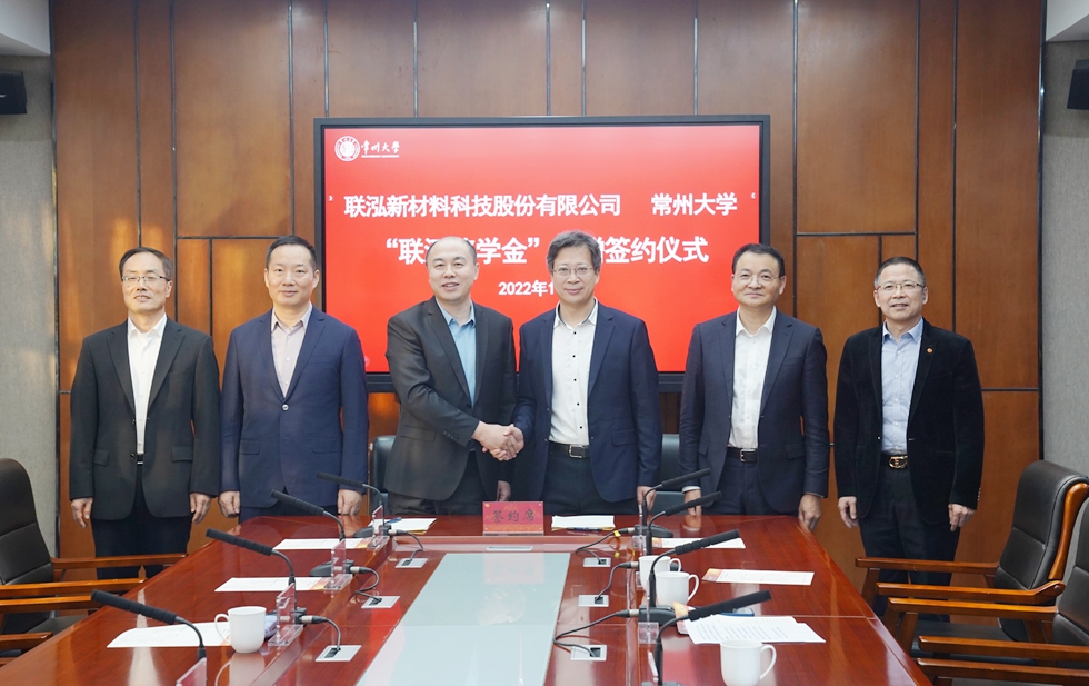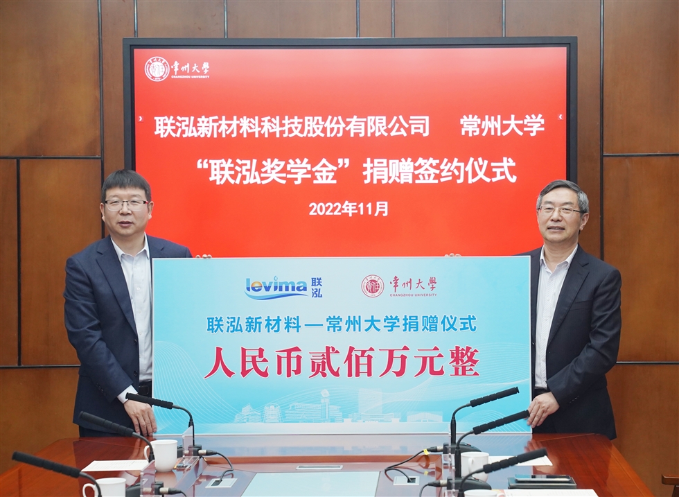 陈群代表学校对联泓新材料科技股份有限公司长期以来对学校事业发展的关心和支持表示感谢,并回顾了双方合作以来取得的丰硕成果。他指出,学校要以此次捐赠为契机,将联泓新材料科技股份有限公司与常州大学建设成为一个“融荣与共,合作共赢”的命运共同体。他强调,双方要紧盯“四个面向”,在产教融合、科技创新、成果转化和高层次人才共享等方面加强深度融合,积极投身科技创新主战场;加强宣传引导,让更多常大学子了解并认同公司的创业精神、企业文化,积极投身中国新能源材料研究开发;增强与校友的情感联系,群策群力,共生共荣,推进学校早日建成特色鲜明的高水平地方领军型大学。