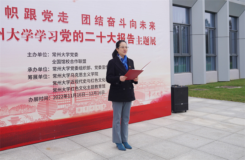 12月1日,《高举旗帜跟党走 团结奋斗向未来——常州大学学习党的二十大报告主题展巡回展》在西太湖校区开展。党委常委、宣传部部长杨琳,马克思主义学院名誉院长、近现代史与红色文化研究院院长、红色文化主题教育馆馆长朱成山出席活动。西太湖校区管委会、近现代史与红色文化研究院相关负责人,外国语学院和周有光文学院部分师生参加活动。