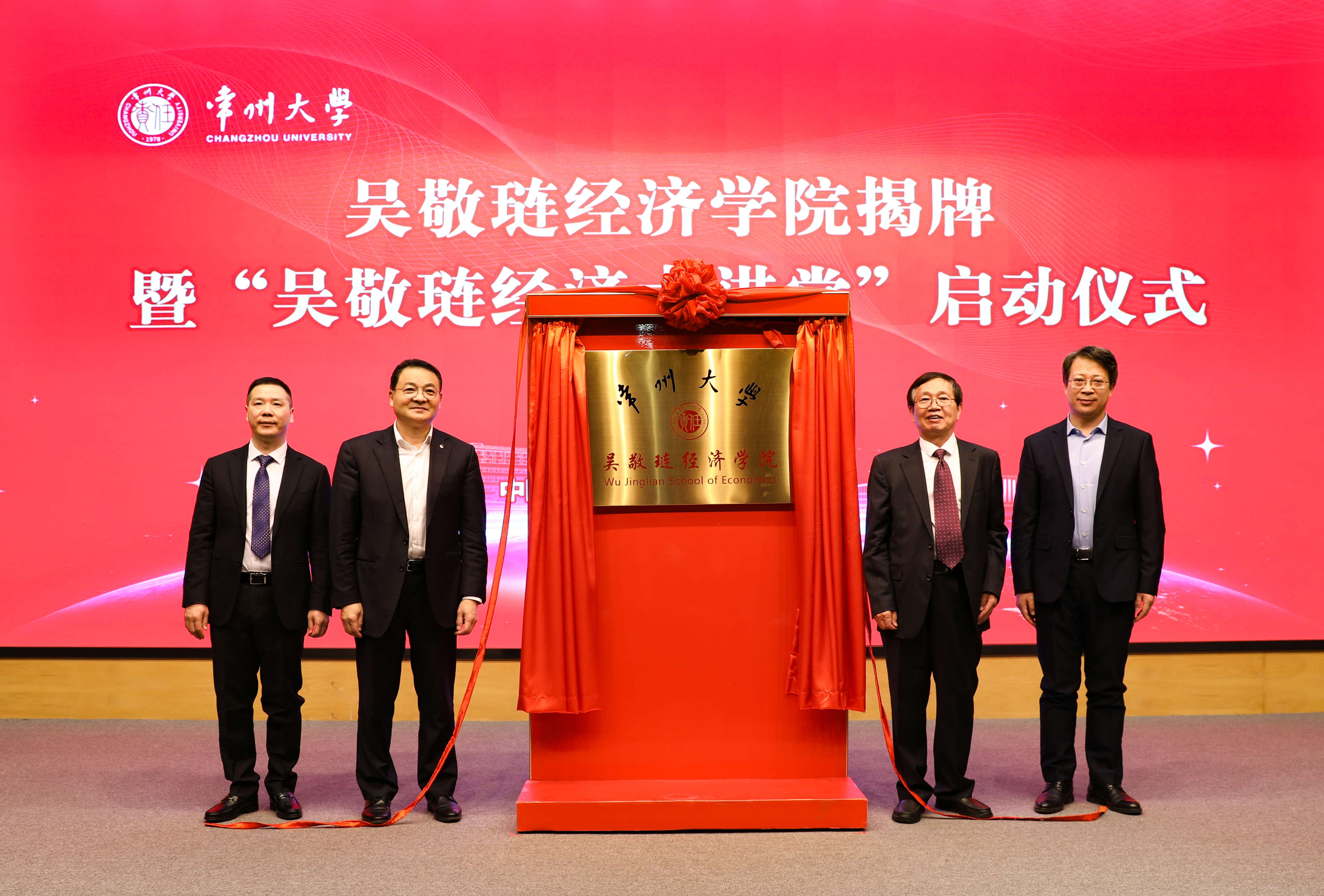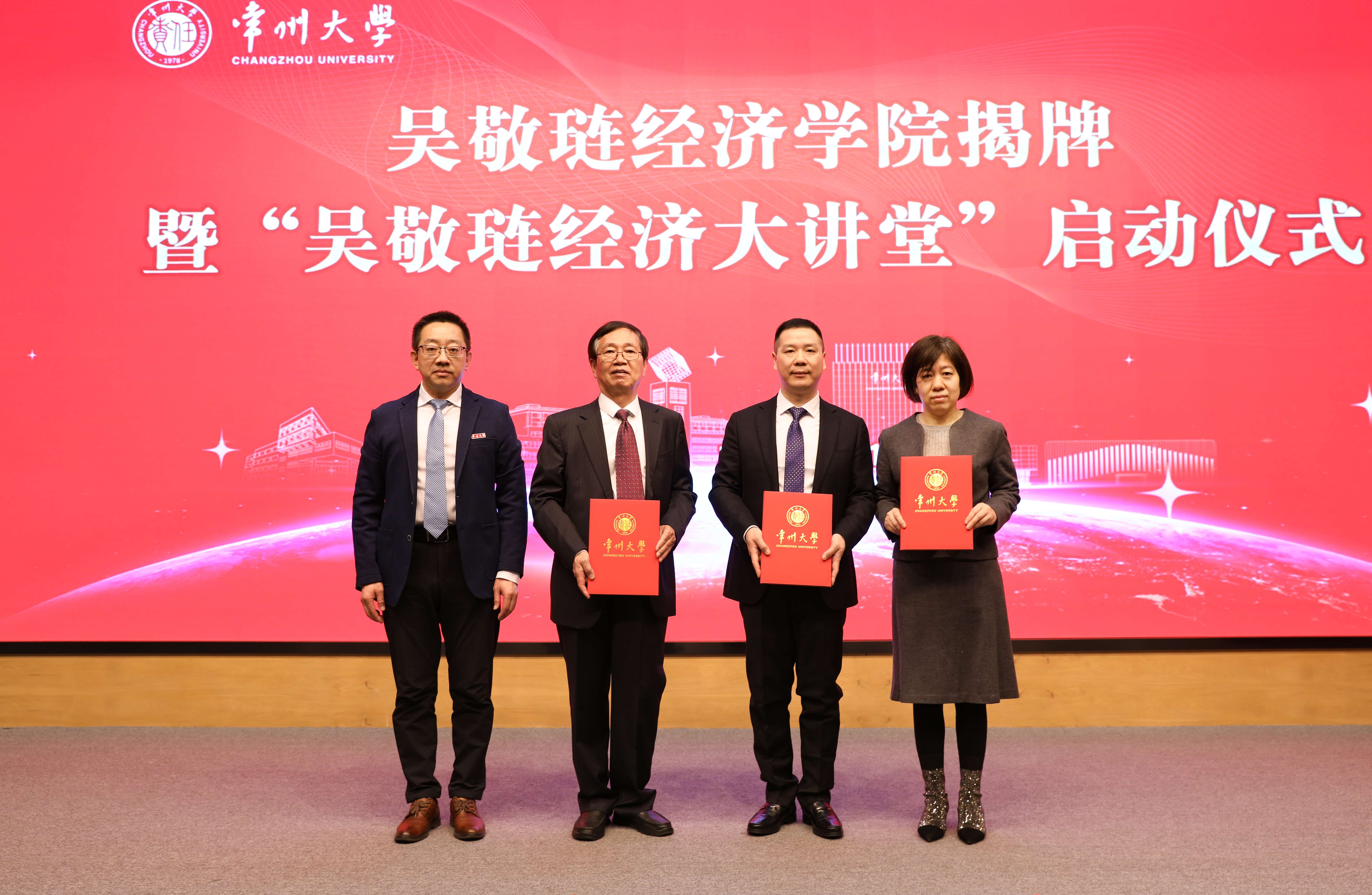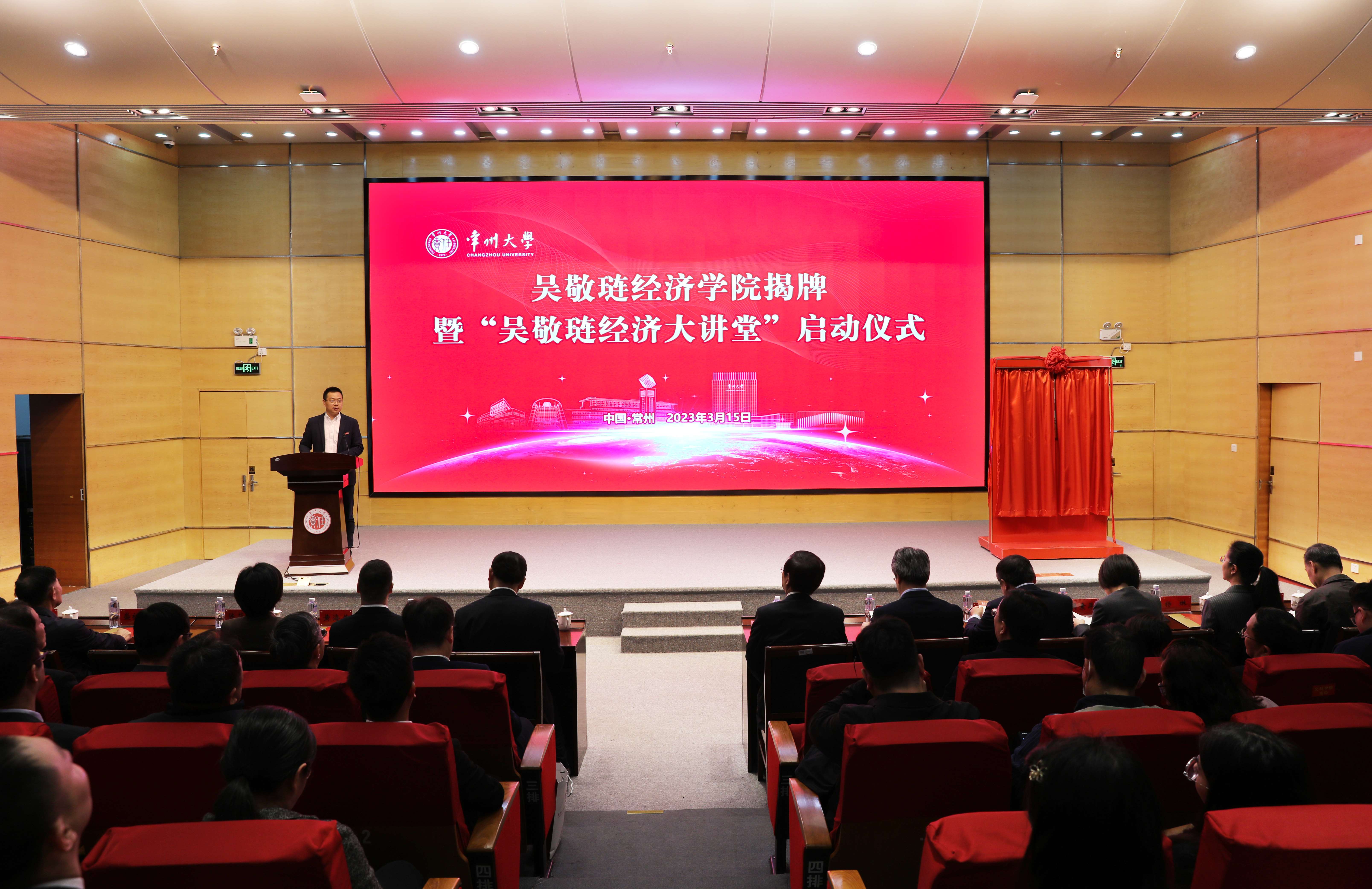 3月15日上午,常州大学吴敬琏经济学院揭牌暨“吴敬琏经济大讲堂”启动仪式在科教城校区文彰楼报告厅举行。国家发改委宏观经济研究院原副院长、中国人民大学发展与改革研究院常务副院长马晓河,第七大道执行董事兼CFO、无锡市上市公司协会副秘书长李正全,孙冶方基金会理事长顾问葛俊,中信出版集团《比较》杂志副主编吴素萍,常州市人大常委会委员、财政经济委员会副主任委员李亚雄,常州市政府研究室原主任盛祖祥,常州市现代企业发展研究会会长周俊,常州市现代企业发展研究会常务副会长、派德科技董事长卢文晓,常州汇塑勤业进出口有限公司总经理陈祥应邀出席。我校党委书记陈群,党委副书记、校长徐守坤,党委常委、副校长黄海燕,党委常委、总会计师陆华良,党委常委、宣传部部长杨琳出席活动。学校相关职能部门负责人、文科学院负责人和教师、学生代表参加活动。陆华良主持活动。