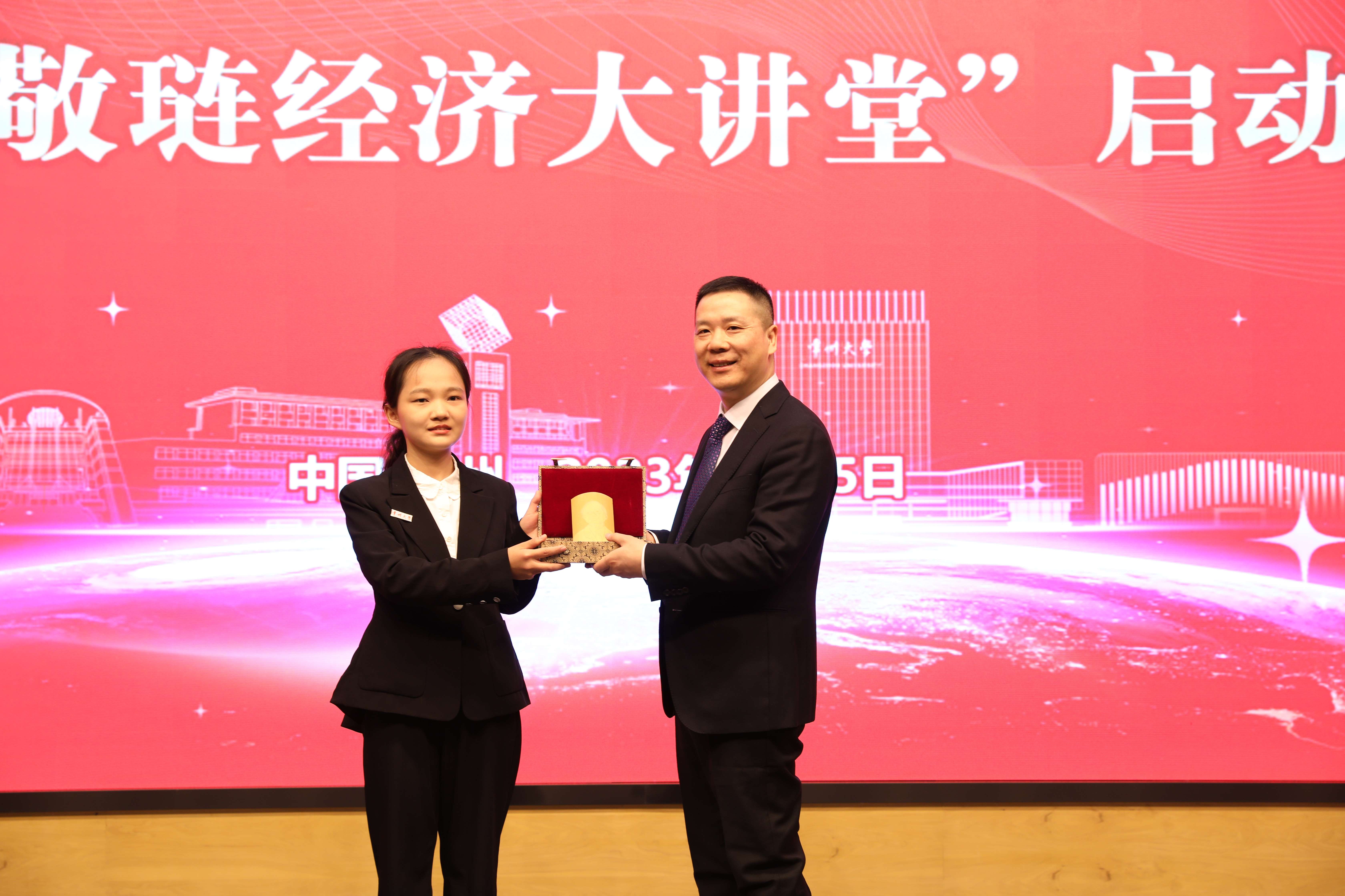 黄海燕宣读学院更名文件。马晓河、李正全、陈群、徐守坤共同为吴敬琏经济学院揭牌。吴敬琏教授受聘为学院名誉院长,马晓河、李正全、吴素萍受聘为学院客座教授。李正全代表吴敬琏教授接受学生代表敬赠留青竹刻。吴素萍代表吴敬琏教授向学院捐赠图书。