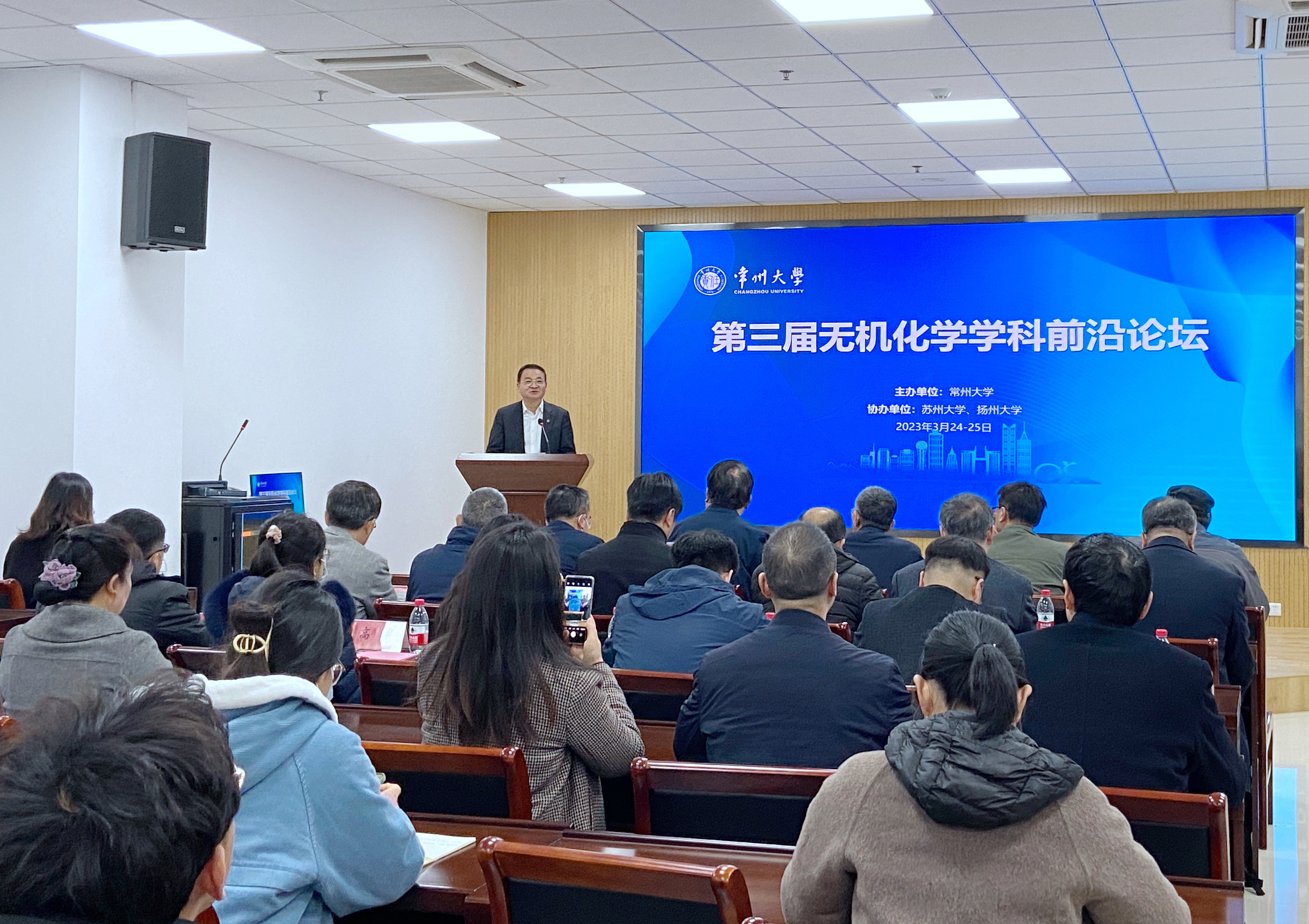 3月24日,第三届无机化学学科前沿论坛在我校举办。中山大学陈小明院士、南开大学卜显和院士、国家自然科学基金委陈荣教授、中科院福建物质结构研究所所长曹荣研究员、教育部化学类专业教学指导委员会副主任委员王尧宇教授、南京大学段春迎教授、中山大学毛宗万教授、苏州大学郎建平教授、天津理工大学鲁统部教授、北京理工大学杨国昱教授、上海交通大学崔勇教授、清华大学王训教授、兰州大学唐瑜教授、扬州大学庞欢教授、Wiley编辑高洋博士,常州大学党委书记陈群和石油化工学院部分教师出席论坛。论坛由常州大学主办,苏州大学和扬州大学协办。