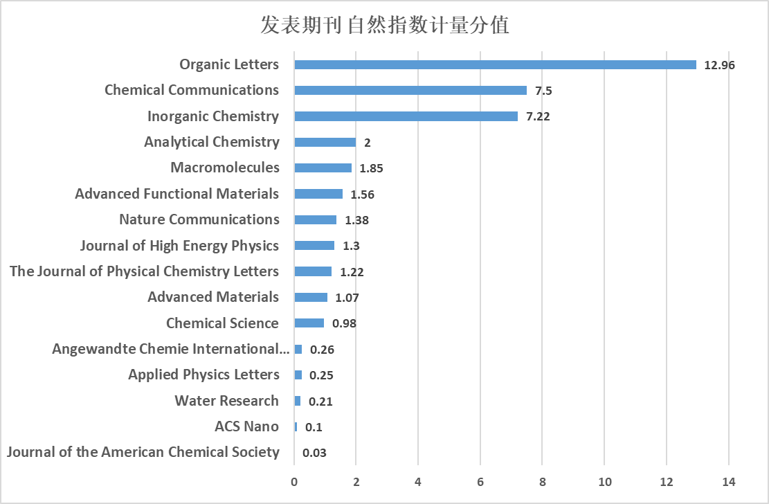我校教师发表的高水平论文共涉及16种自然指数期刊,其中贡献度排名前5位的期刊分别是Organic Letters(分值为12.96,占比32.49%)、Chemical Communications(分值为7.5,占比18.80%)、Inorganic Chemistry(分值为7.22,占比18.10%)、Analytical Chemistry(分值为2,占比5.01%)、Macromolecules(分值为1.85,占比4.64%)。