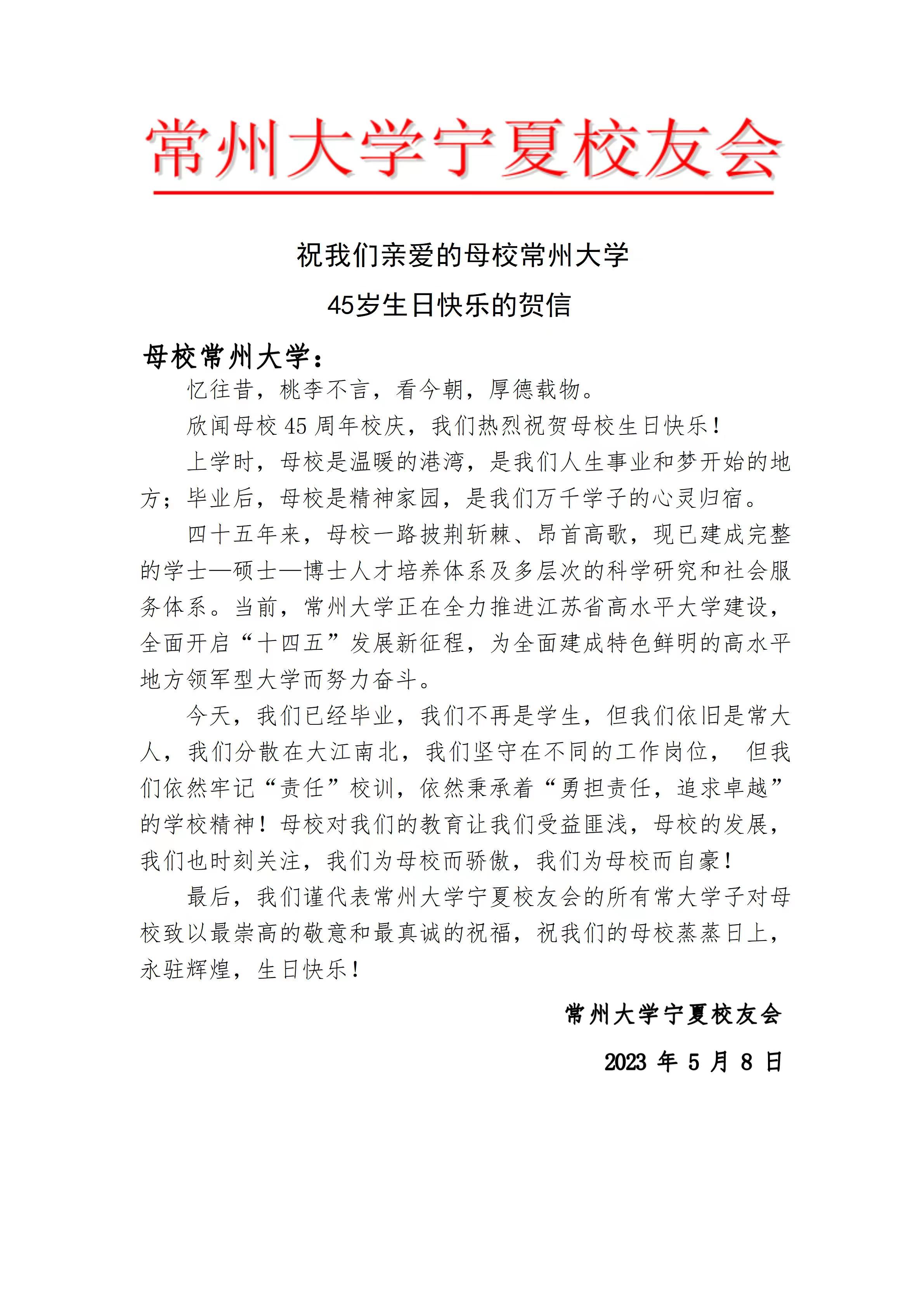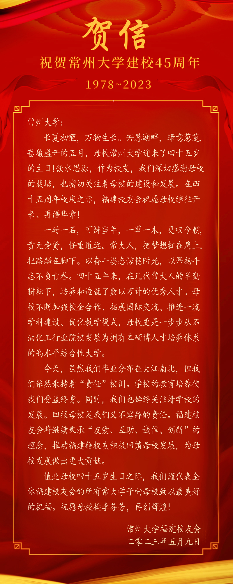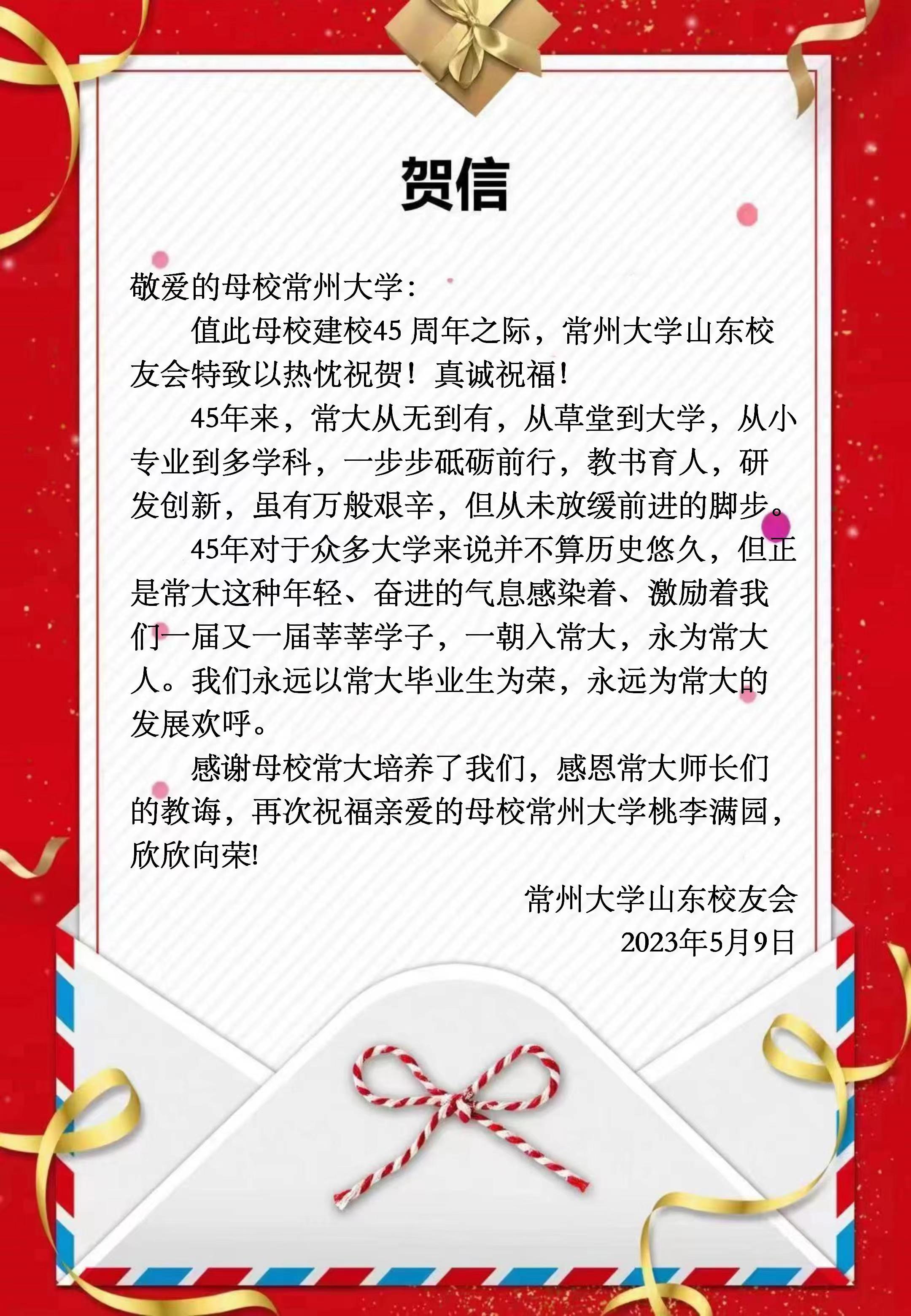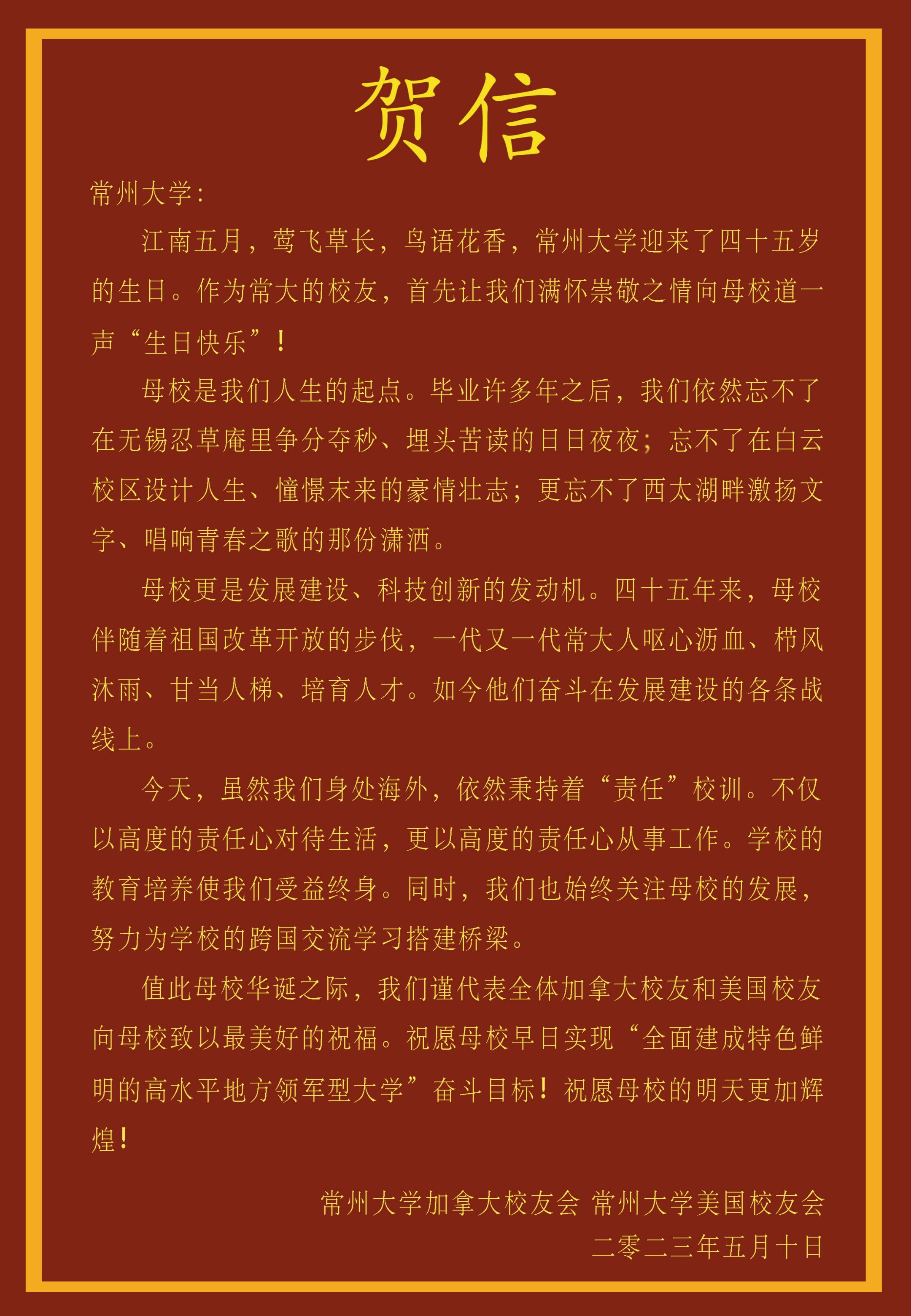 2023年5月10日,常州大学喜迎建校四十五周年校庆,学校收到了来自美国、加拿大及全国各地校友会的热烈祝贺和美好祝愿。贺信对学校四十五周年华诞表示热烈祝贺,对学校为国家培养了众多具有“责任”精神的杰出校友表示赞扬,祝福常州大学在今后的高质量发展中取得更辉煌的成绩,早日实现“全面建成特色鲜明的高水平地方领军型大学”的奋斗目标。(贺信排名顺序不分先后)(通讯员/石晨迪 审核/李晓明 编辑/孙悦)