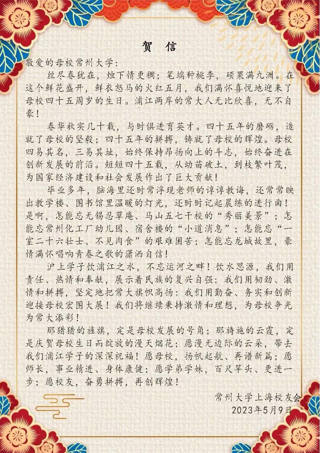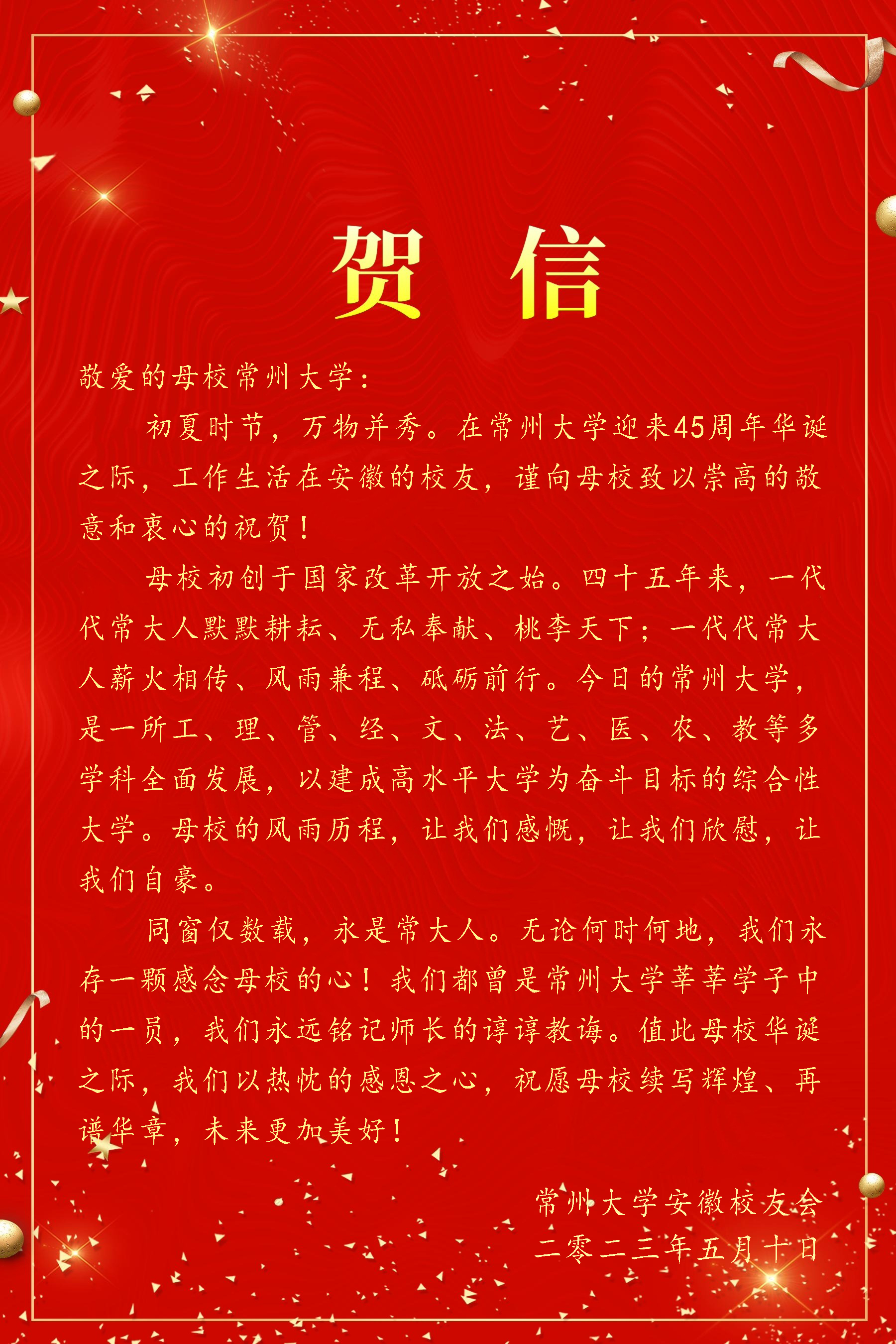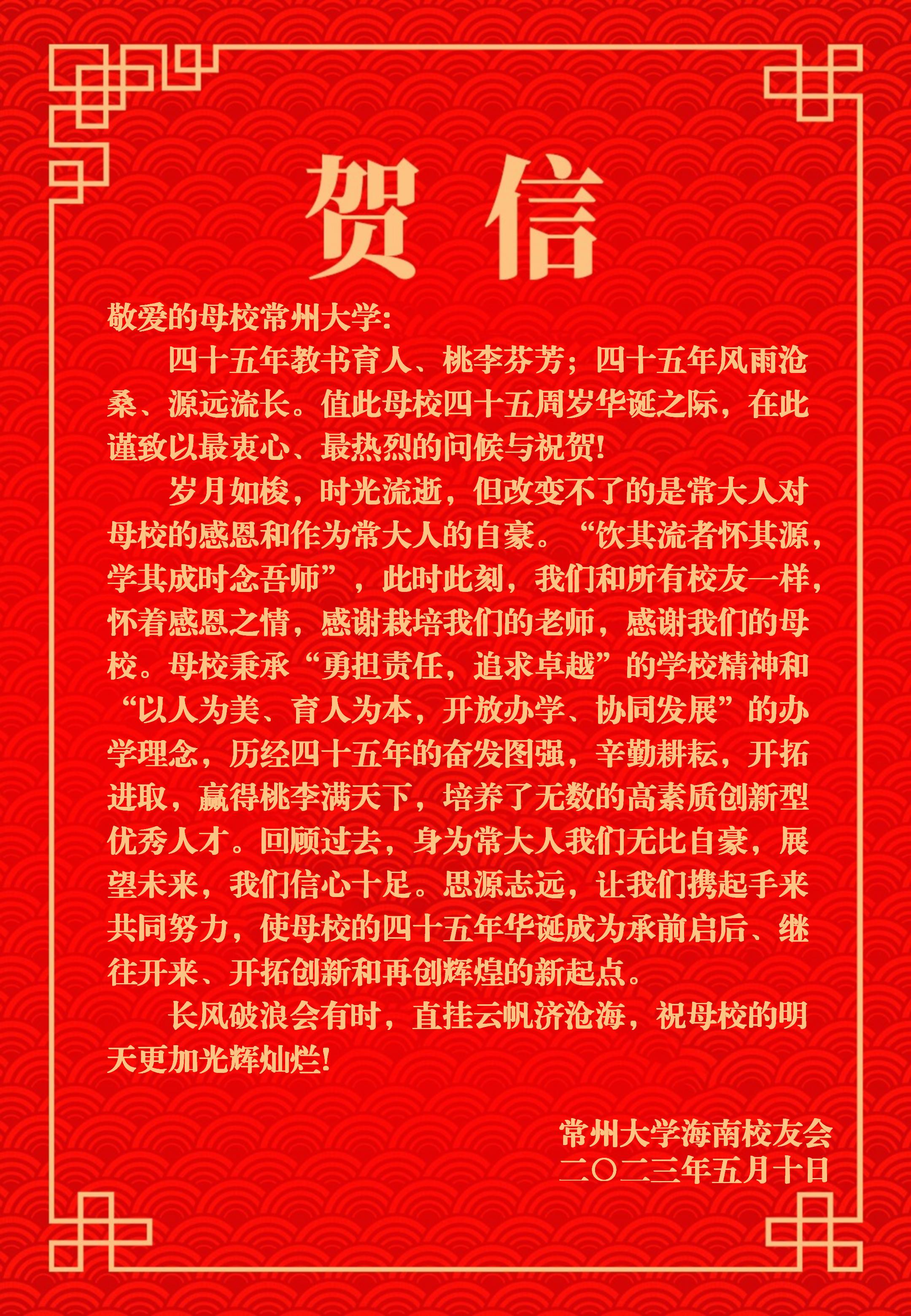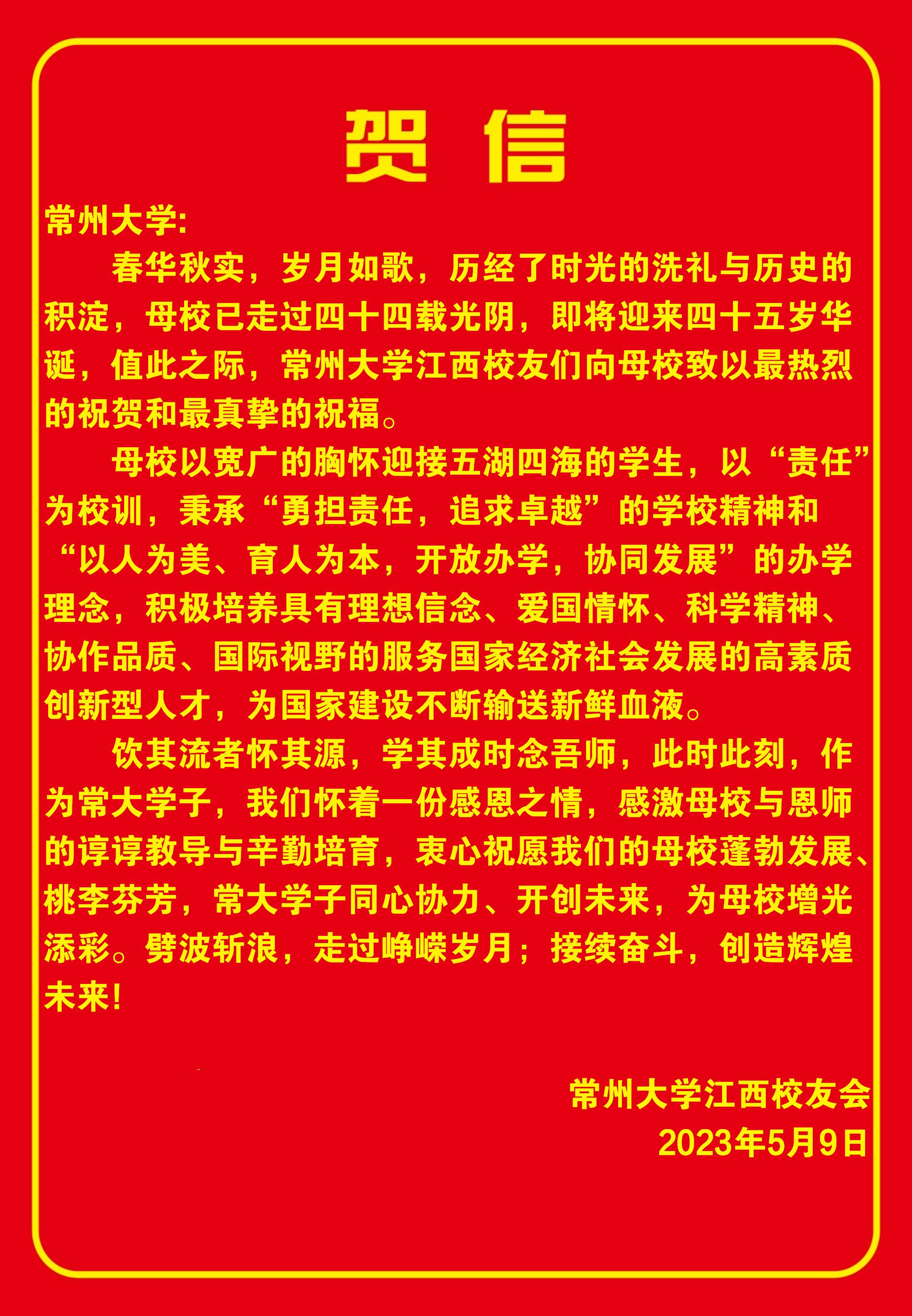 2023年5月10日,常州大学喜迎建校四十五周年校庆,学校收到了来自美国、加拿大及全国各地校友会的热烈祝贺和美好祝愿。贺信对学校四十五周年华诞表示热烈祝贺,对学校为国家培养了众多具有“责任”精神的杰出校友表示赞扬,祝福常州大学在今后的高质量发展中取得更辉煌的成绩,早日实现“全面建成特色鲜明的高水平地方领军型大学”的奋斗目标。(贺信排名顺序不分先后)(通讯员/石晨迪 审核/李晓明 编辑/孙悦)