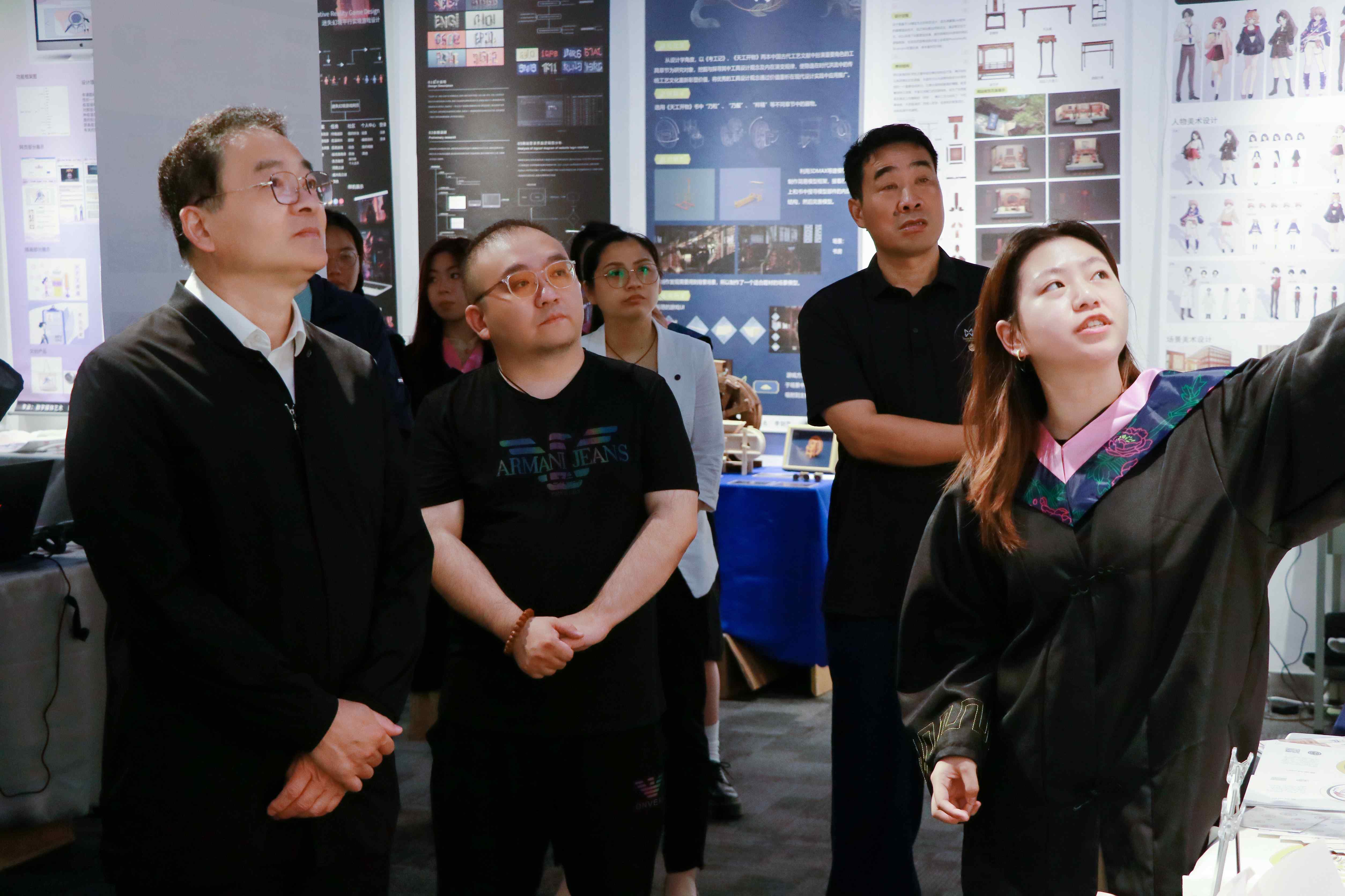 5月30日下午,党委书记陈群到美术与设计学院指导2023届本科毕业作品展,美术与设计学院领导班子、各系指导老师及毕业生学生代表陪同参观展览。