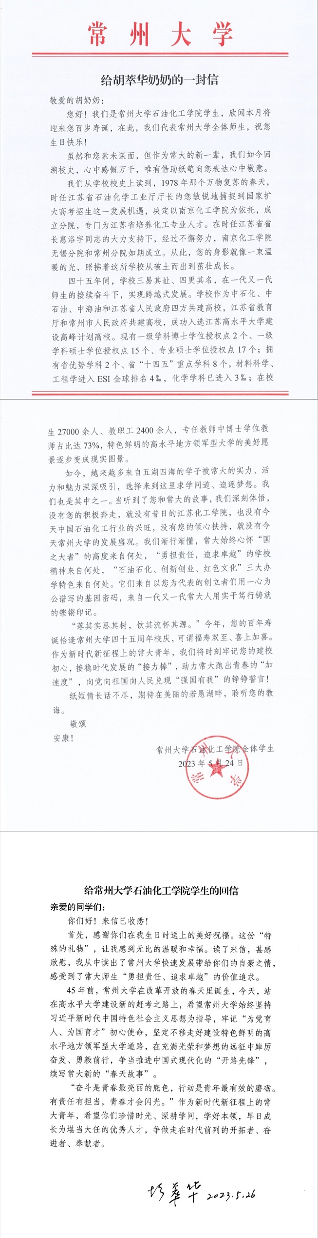 胡老高兴地回忆起寿诞前夕与常大学子通信的故事。不久前,石油化工学院学生得知,他们万分敬仰的胡萃华奶奶即将迎来百岁寿诞。为了表达心中敬意,同学们给胡奶奶写了一封信,信中汇报了学校发展变化的情况和他们奋发学习的志向。胡老在回信中高度肯定学校45年来的跨越式发展,并寄语常大学子珍惜时光,深耕学问,学好本领,早日成长为堪当大任的优秀人才,争做走在时代前列的开拓者、奋进者和奉献者。