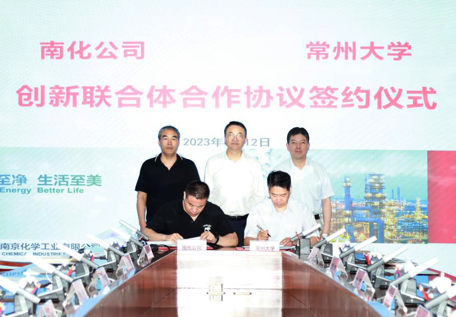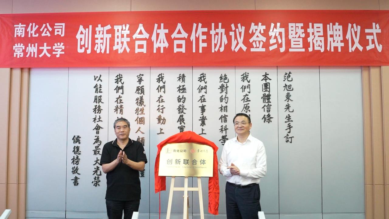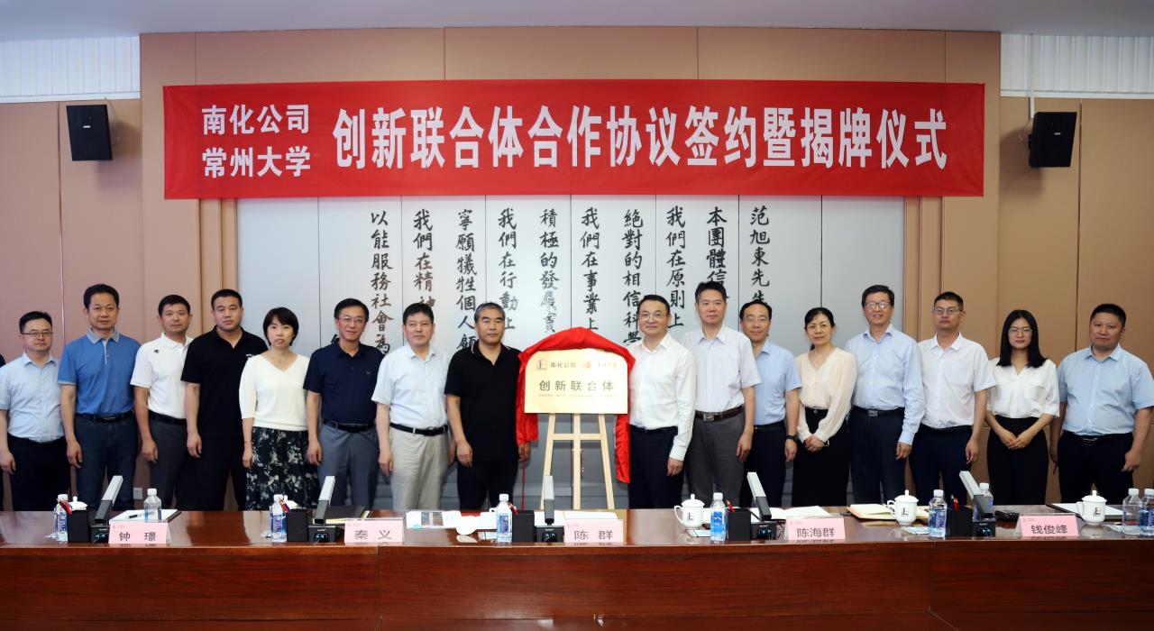创新联合体办公室、中石化联合所常州大学分所负责人简要介绍了创新联合体的准备工作情况。南化公司总经理助理兼科技发展部经理邱祥海和陈海群签署双方共建创新联合体合作协议。叶晓东和陈群共同为创新联合体揭牌。
