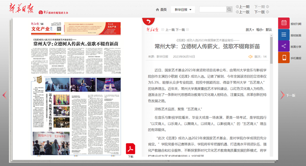 6月16日,《新华日报》文化产业版头条以“常州大学:立德树人传薪火,弦歌不辍育新苗”为题报道我校音乐与影视学院办学成果,文章从“淬炼艺术品质,聚焦‘五艺育人’”“坚定文化自信,激荡奋进力量”“跟进社会需求,产教融合破局”等方面阐述了我校坚持“五艺育人”的培养理念,高度重视艺术学科建设,以红色文化育人为特色,着力加强艺术专业人才培养,走出了一条新时代思想政治教育与文化育人相结合、注重实践、改革创新的特色发展之路。全文如下: