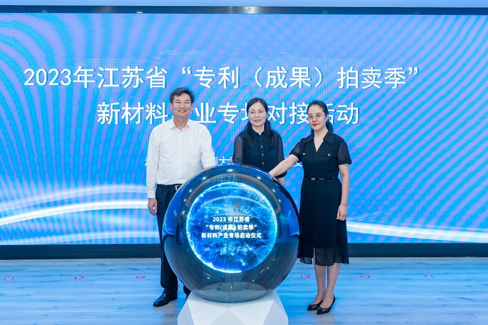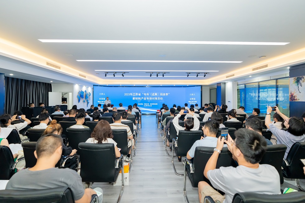 7月21日下午,2023年江苏省“专利(成果)拍卖季”新材料产业专场第一场对接活动在我校举行。江苏省科技资源统筹服务中心党委委员、江苏省技术产权交易市场总经理肖莺,常州大学党委常委、宣传部部长杨琳,常州市科技局专职委员赵新出席并启动新材料产业专场活动。南京大学常州研究院、南京工业大学、江苏省发明协会、江苏银行、长三角碳材料技术创新中心等机构以及60余家新材料企业代表参加本次对接活动。活动由常州大学产学研合作处负责人主持。