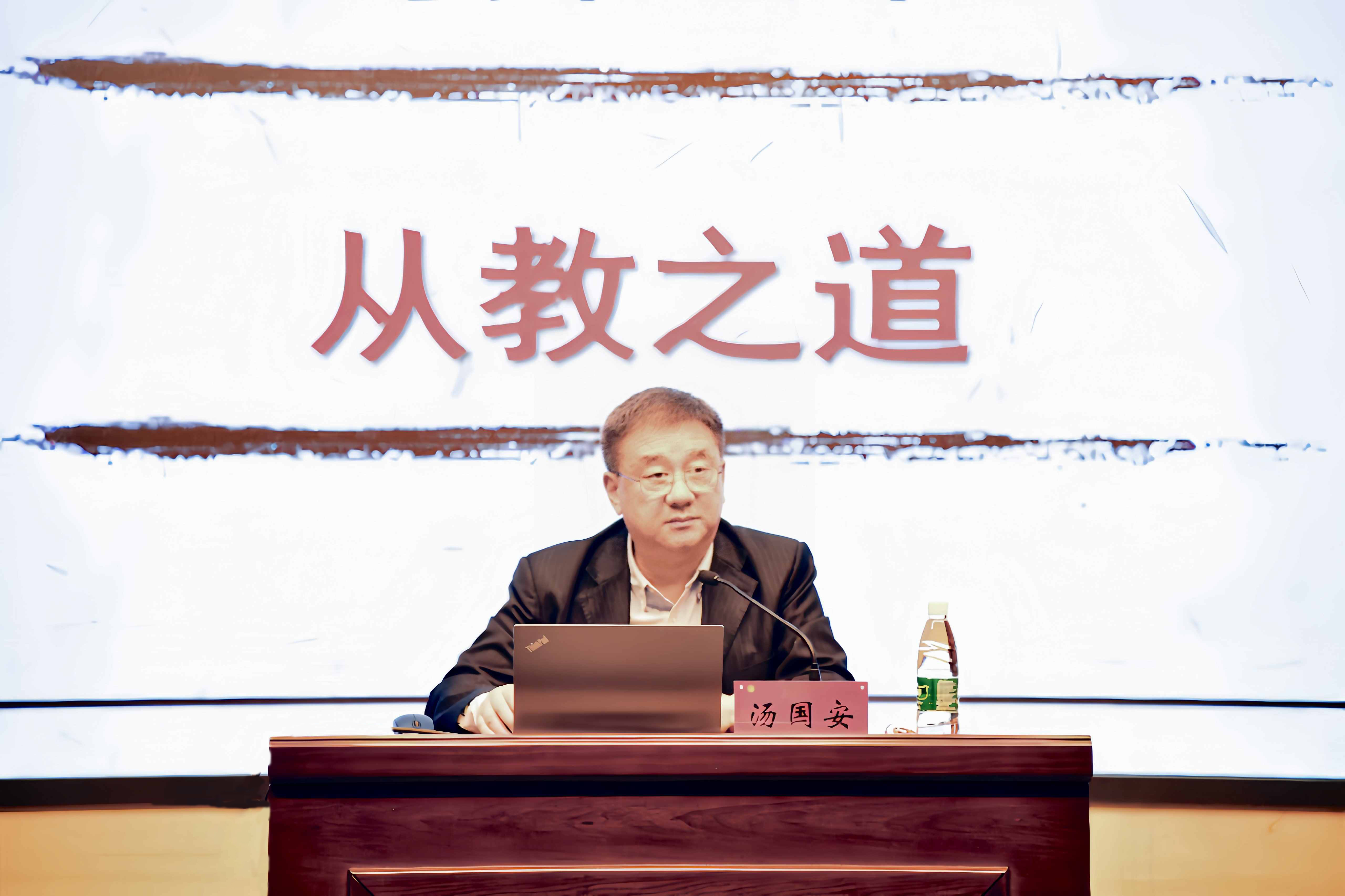 开班典礼结束后,国家级教学名师、南京师范大学汤国安教授以“谈为师之本,从教之道”为题,为新教师讲授岗前培训第一课。汤国安结合党的二十大报告相关精神,以自身为例,围绕学贵得师、为师之本、从教之道等方面为新时代高校教师如何以德立身、以德施教、以德立学、以德育德提供了一个鲜活的范本。