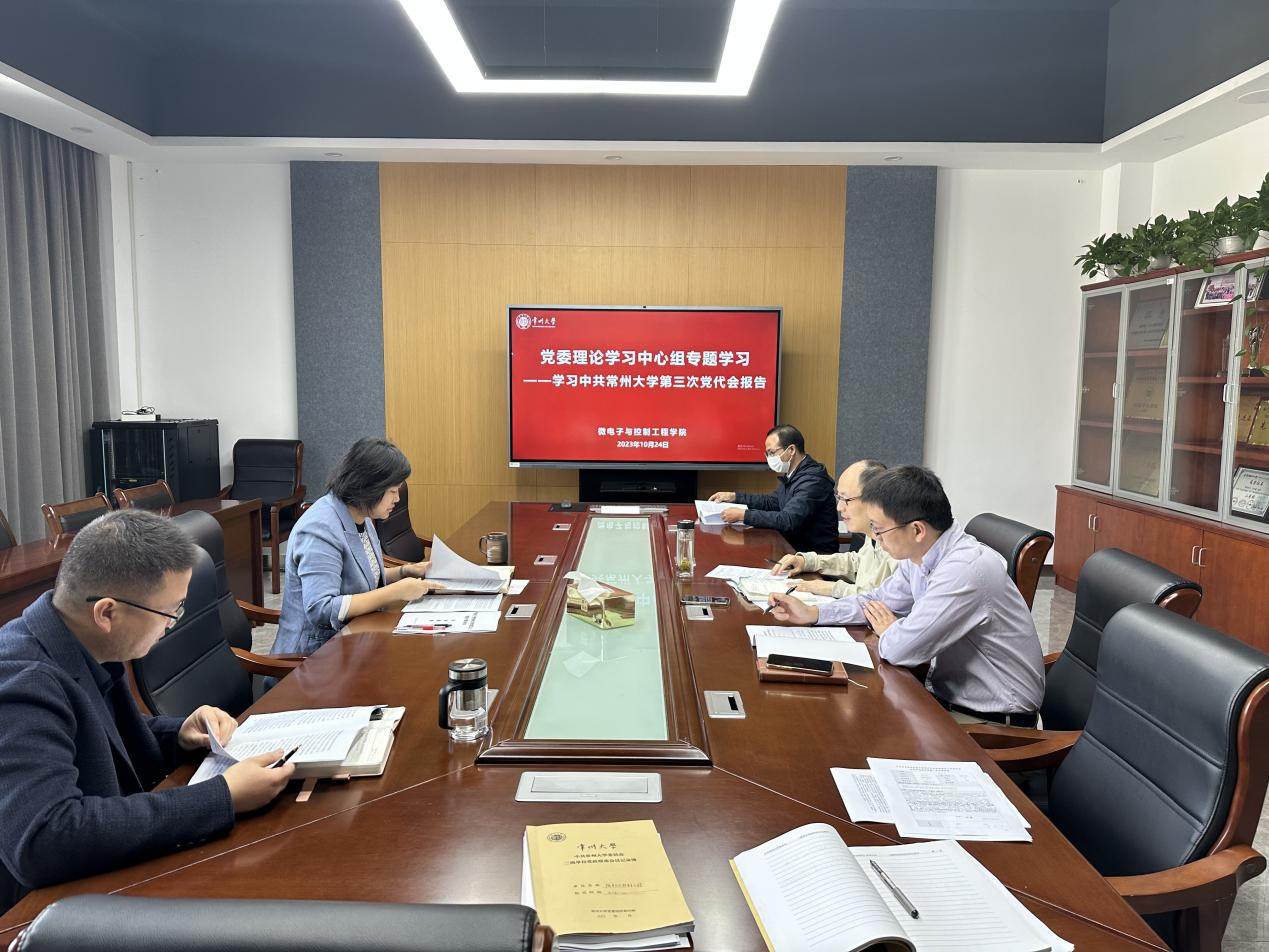 10月24日上午,微电子与控制工程学院在立功楼404召开党委理论学习中心组专题学习会议,集中学习贯彻中国共产党常州大学第三次党员代表大会精神。党委书记吴青玲领学了校党委书记徐守坤所作的《牢记嘱托走在前感恩奋进做示范奋力谱写特色鲜明的高水平地方领军型大学新篇章》报告,重点解读了报告提出的“三大制约”、“四大策略”和“九大行动”。她强调,学院班子要强化担当作为,讲政治、有闯劲、重实干,团结带领学院凝练发展特色,为实现全面建成特色鲜明的高水平地方领军型大学的目标而奋斗。
