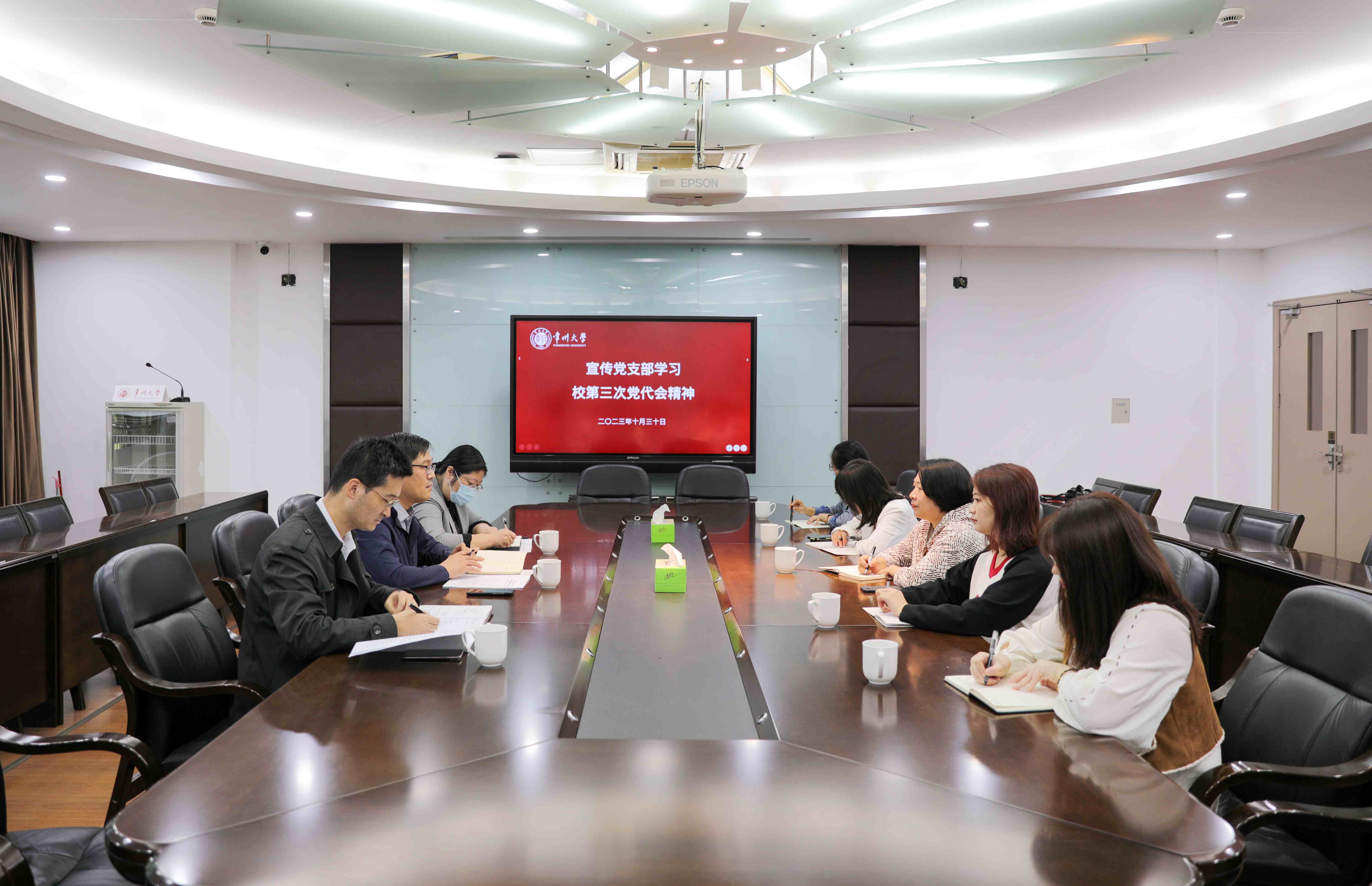 10月30日,宣传部党支部召开党员大会,学习贯彻学校第三次党代会精神。党委常委、宣传部部长薛冰分别从过去五年发展的成果、未来的光荣使命、高质量发展的时代答卷、新时代党的建设新的伟大工程等方面传达了学校第三次党代会报告的主要内容,重点解读了“一个引领、四大策略、九大行动”路线图,同时分析了学校事业发展面临的“三大制约”。薛冰强调,要坚持学深悟透,准确领会党代会精神实质,立足自身工作实际,把学习好、宣传好、贯彻好、落实好党代会精神,作为当前和今后一段时期重要政治任务、工作总纲以及行动指南。大家纷纷表示,要把学习、宣传和贯彻第三次党代会精神作为当前的重要任务,把思想和行动统一到大会的决策部署上来,更加奋发有为推动学校高质量发展。
