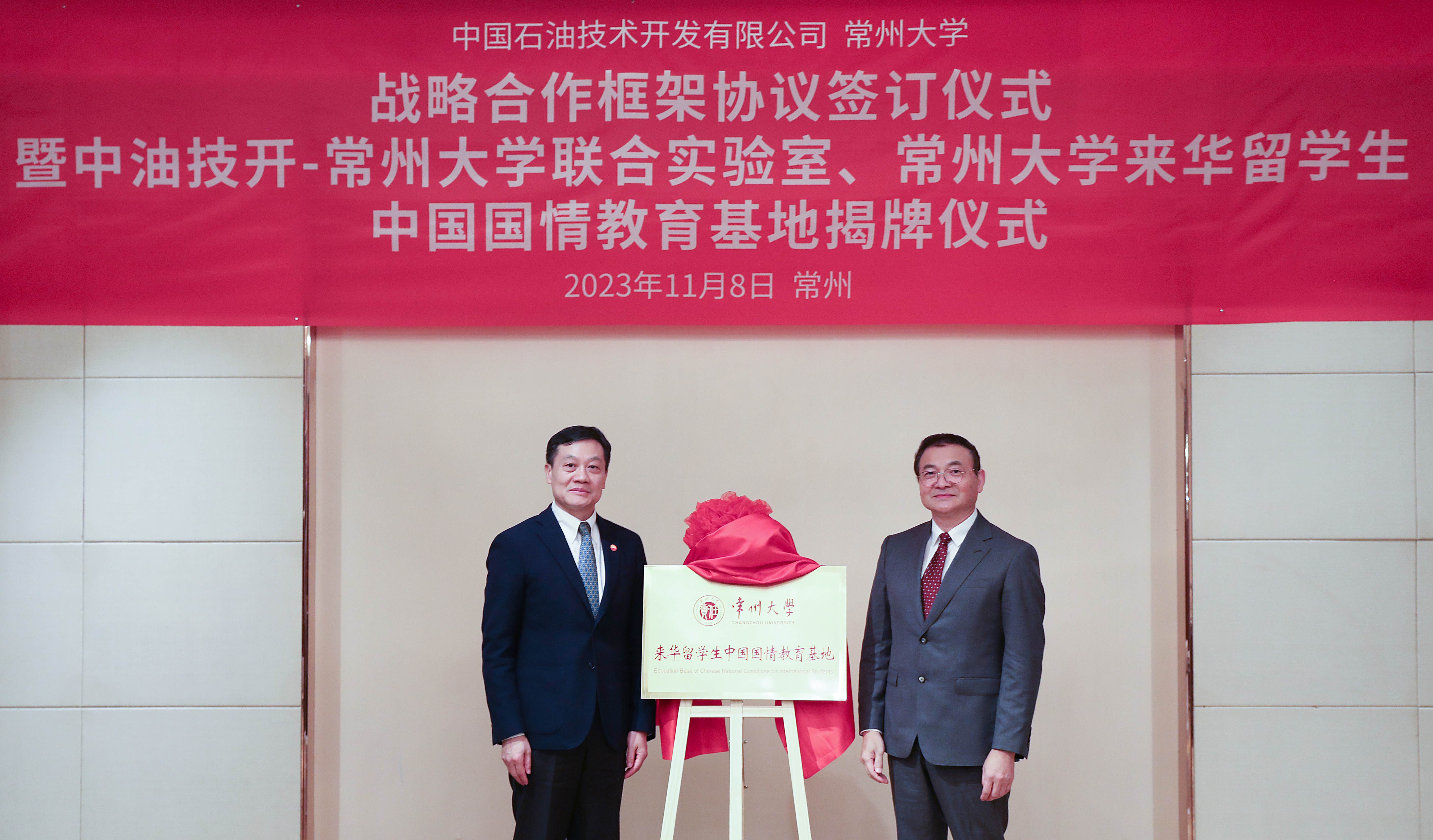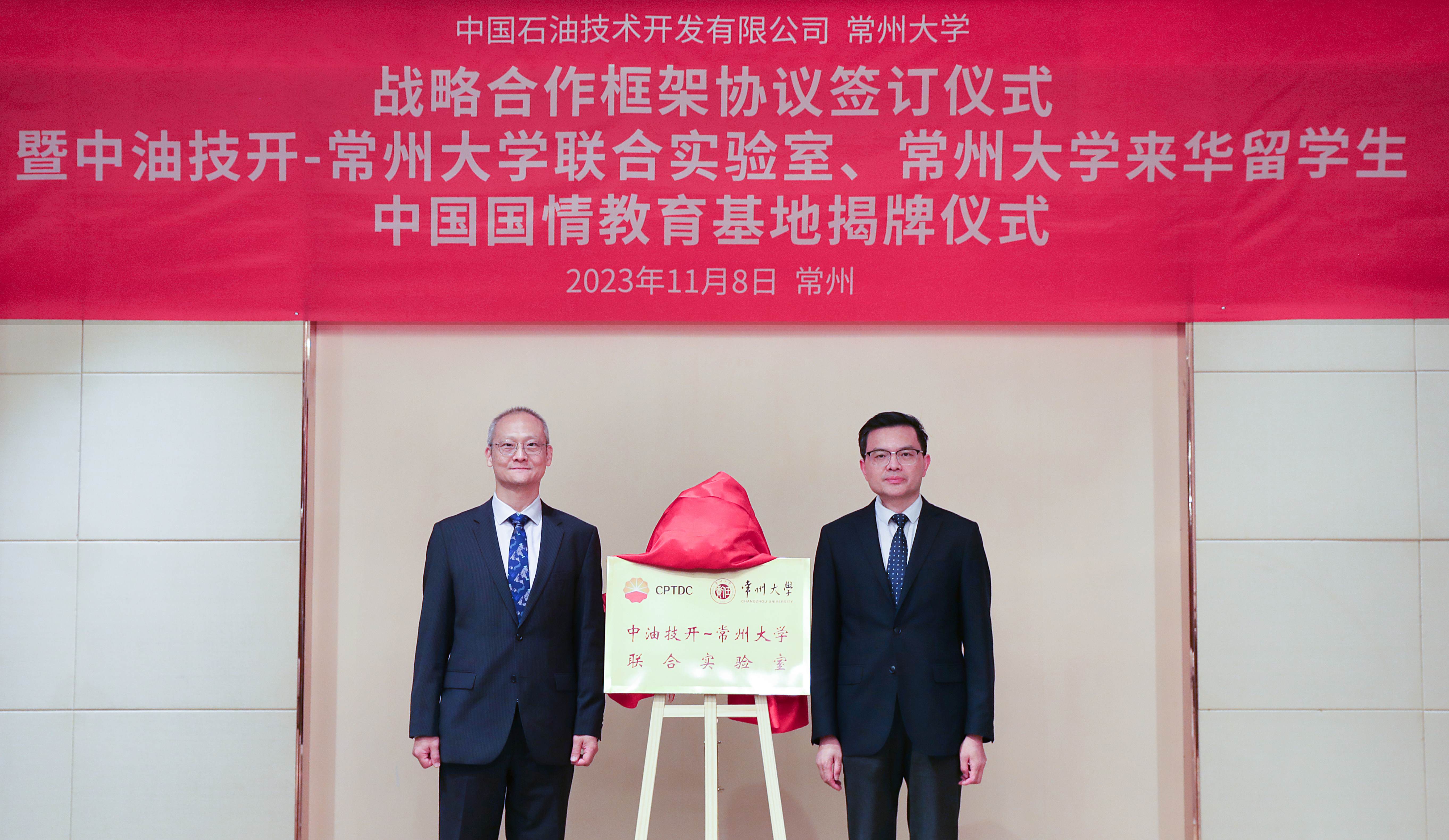 11月8日,中国石油技术开发有限公司(以下简称“中油技开”)与常州大学战略合作框架协议签订仪式暨中油技开-常州大学联合实验室(以下简称“联合实验室”)、常州大学来华留学生中国国情教育基地(以下简称“教育基地”)揭牌仪式在常州举行。中油技开党委副书记、总经理王洪涛,副总经理李强,首席专家薛晓虎,常州大学原党委书记陈群,党委副书记、校长陈海群,副校长晏成林出席会议,中油技开战略发展和市场营销部、石化事业部、中东分公司、美欧分公司负责人,常州大学相关部门、学院负责人及专家参加。晏成林主持会议。