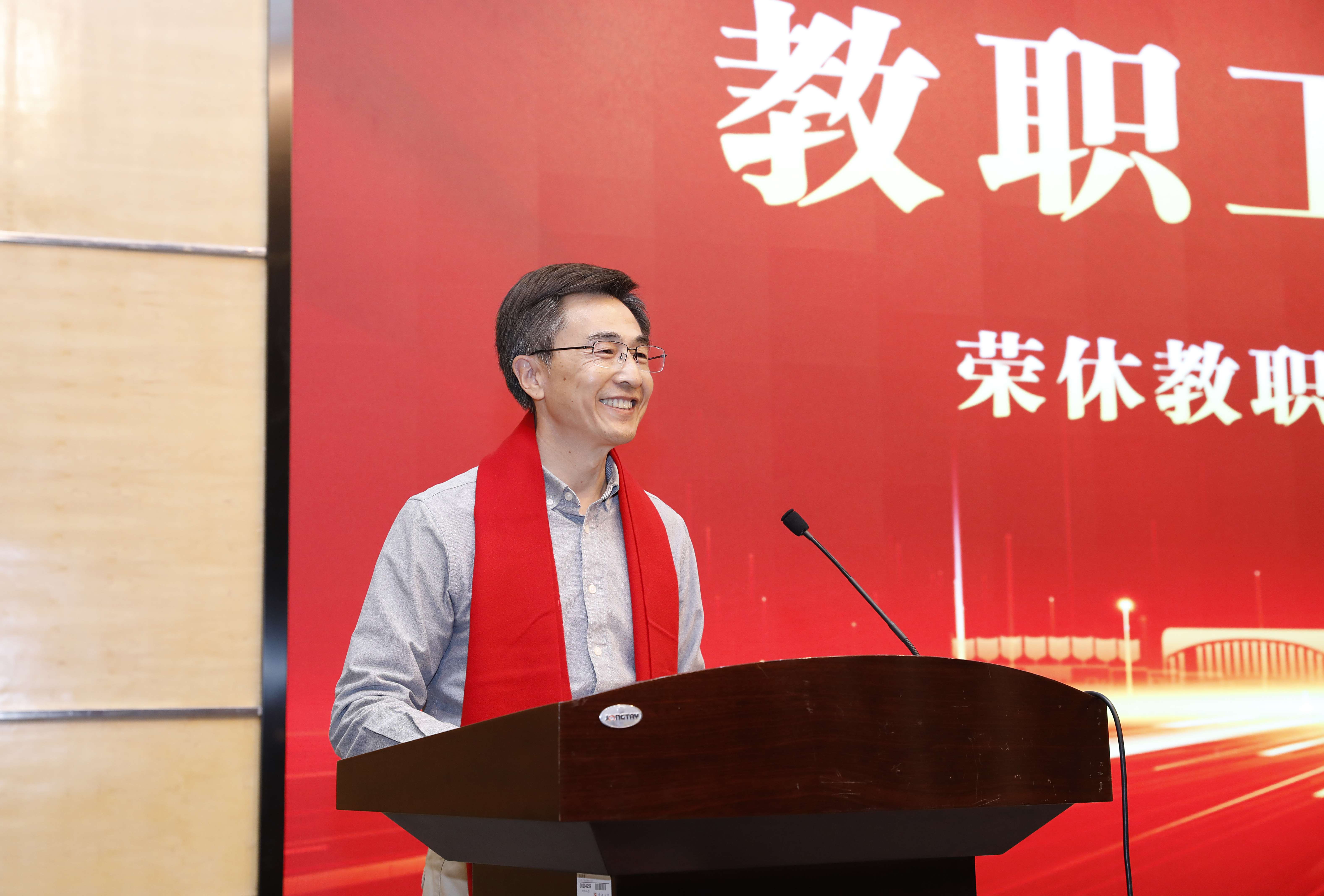 荣休教师代表缪国斌回顾了自己从17周岁到60周岁在常大的学习和工作经历,表达了对学校的感恩和热爱。他感慨,朴实的基因、奋进的精神使学校在火红的年代交出了最优秀的时代答卷。他代表退休教师表态,在过好退休生活的同时,会持续关注学校发展,随时响应学校号召,并对学校未来的发展表达了美好祝愿。