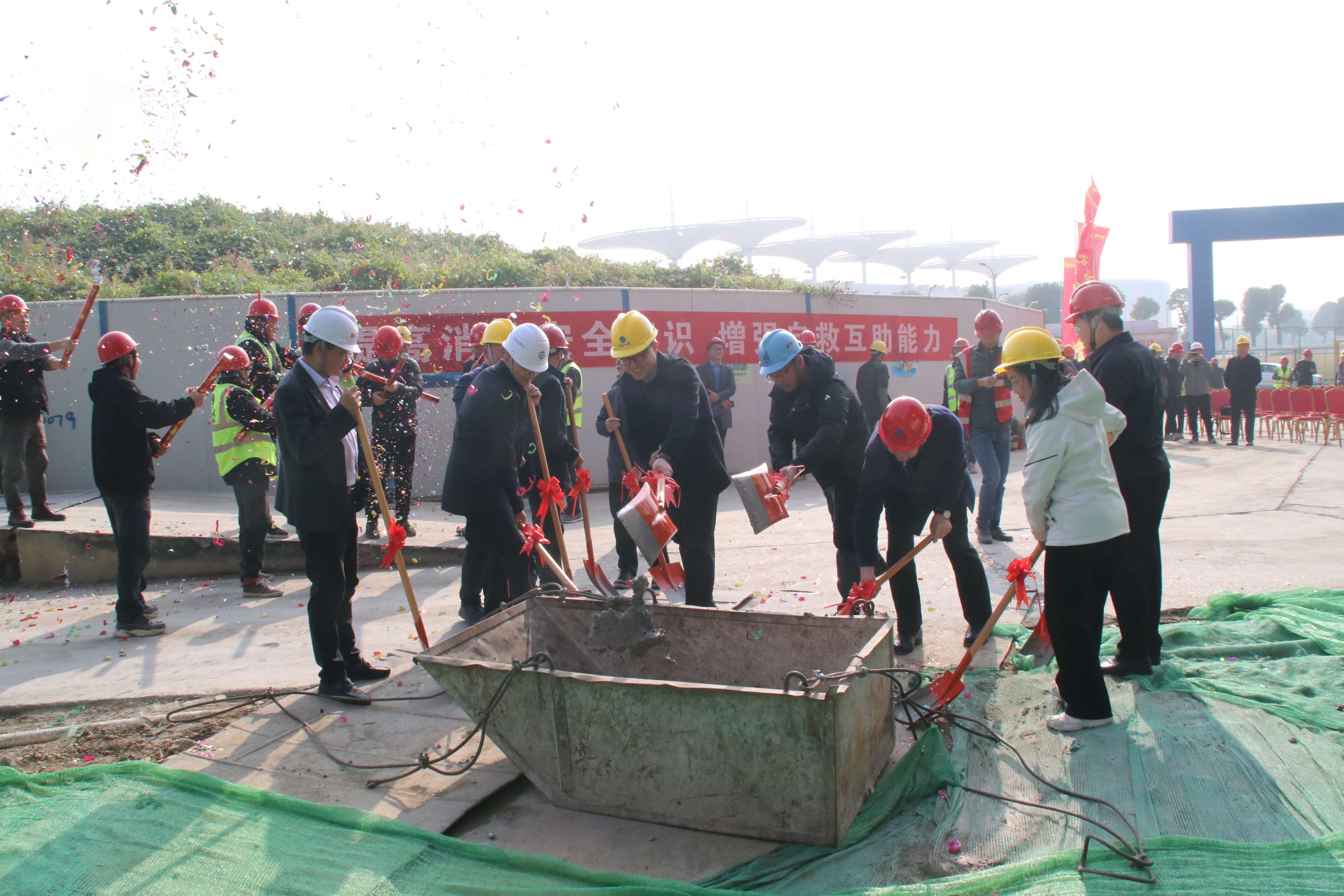 参加仪式的领导和嘉宾共同为项目浇筑最后一方混凝土,封顶仪式顺利完成。