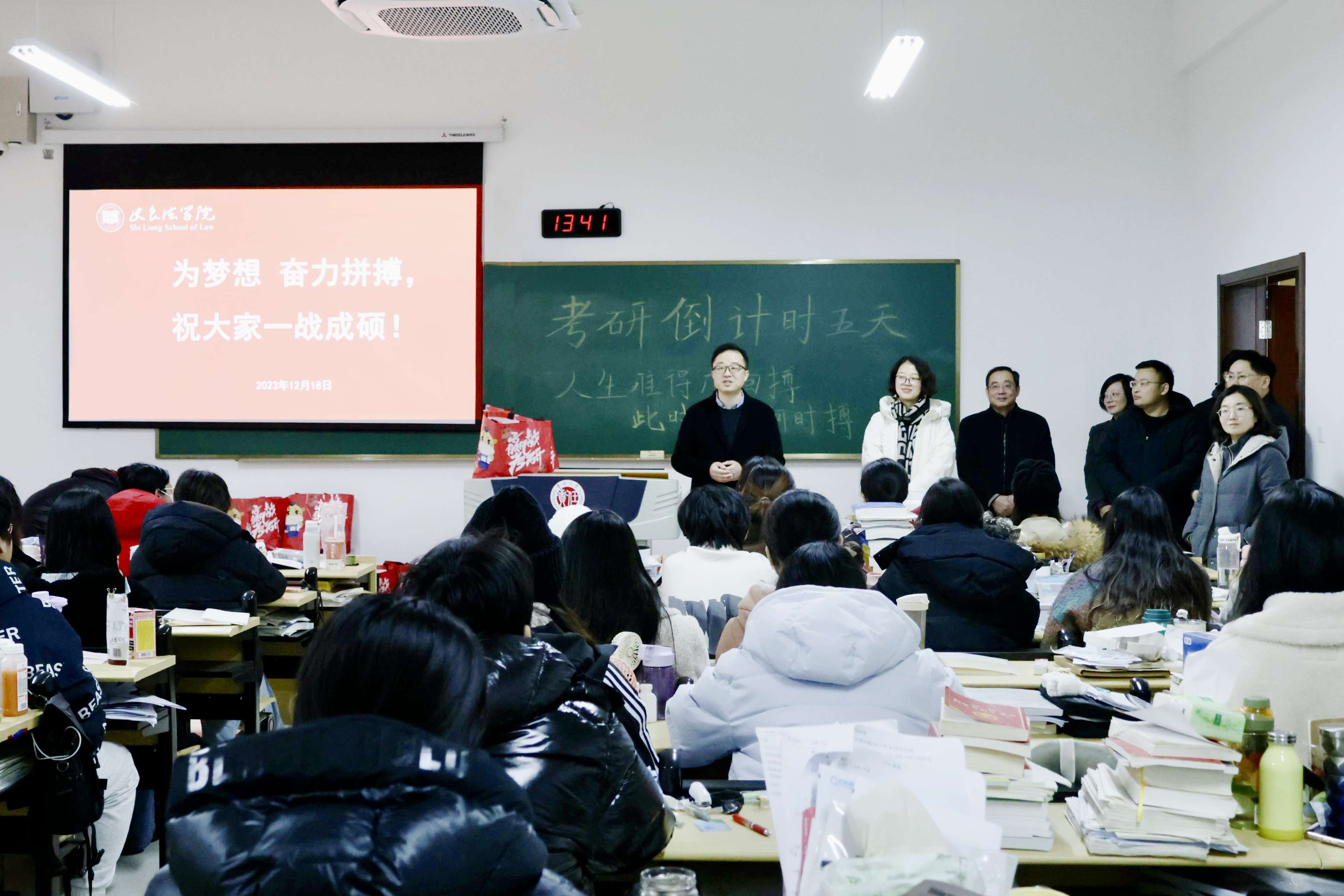 陈海群代表校领导和老师向考研学生表示关怀与慰问。他亲切询问了同学们的复习备考及生活保障等情况,对大家咬定考研目标、敢于突破自我的精神表示赞赏与肯定。他希望同学们增强备考信心,调整复习方法,注意劳逸结合,在最后的冲刺阶段全力以赴,以最佳的精神状态迎接初试的挑战。他将学校精心准备的“考研加油包”发放到考研学子的手中,预祝同学们金榜“糕”中,一战成“硕”。
