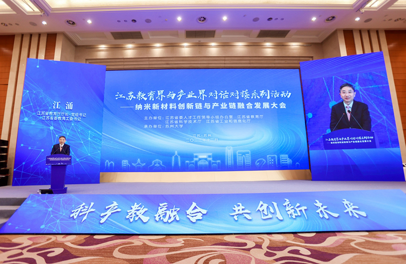 12月23日,江苏教育界与产业界对话对接系列活动——纳米新材料创新链与产业链融合发展大会在苏州召开。会议由省教育厅、省委人才办、科技厅、工信厅共同主办,苏州大学承办,江苏省教育厅厅长江涌、苏州大学党委书记张晓宏、苏州市副市长季晶、江苏省工信厅副厅长张星,以及中国科学院院士李述汤、迟力峰、顾宁等出席活动。常州大学副校长晏成林,协同创新管理办公室、创新联合体办公室负责人及相关协同创新中心负责人员参会。
