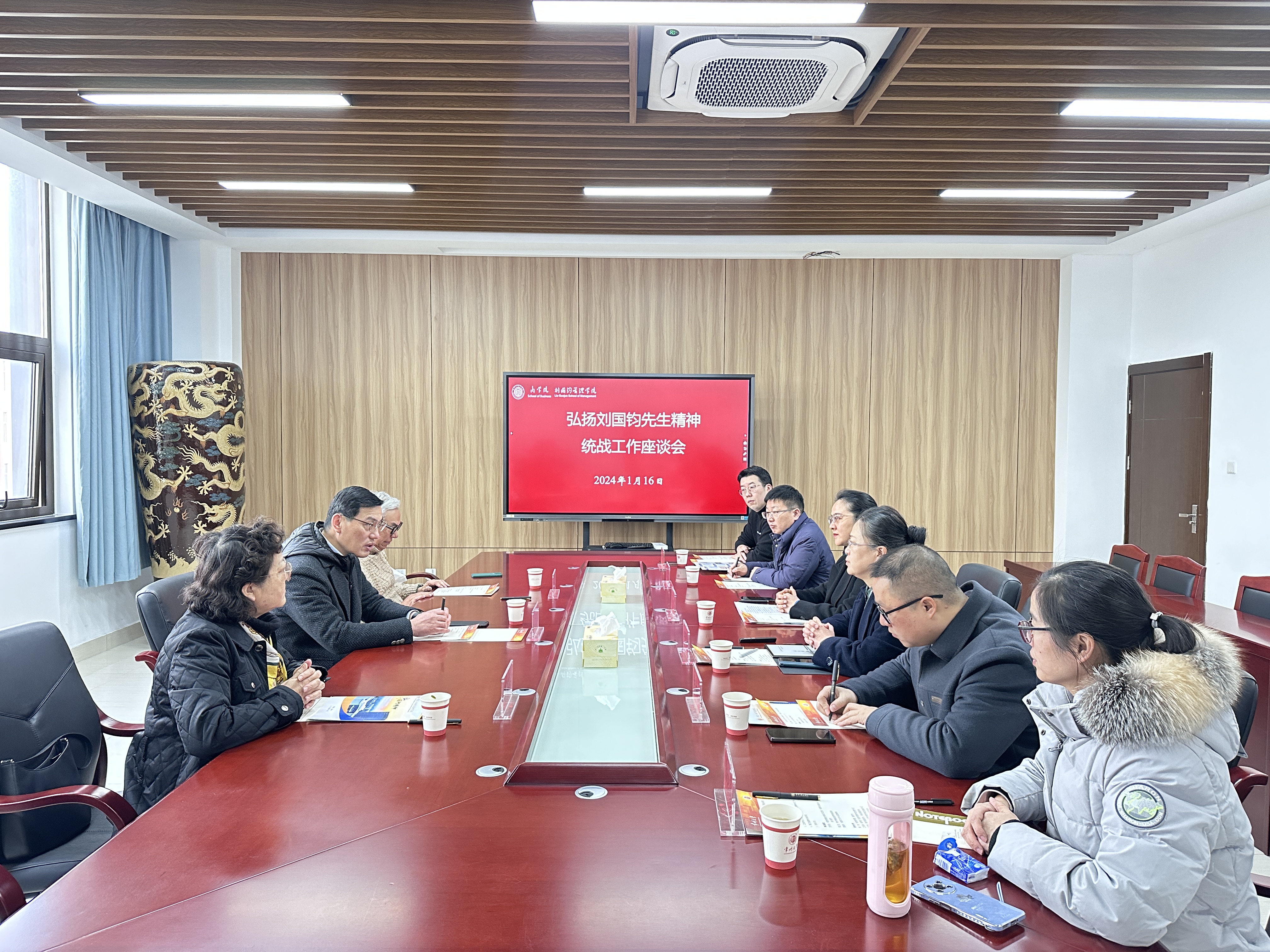 商学院负责人汇报了刘国钧管理学院的发展历程,并表示学院将继续立足冠名特色,弘扬刘国钧精神,加强刘国钧文化研究,致力于培养有理想、有责任、创新型商科人才,切实落实刘国钧精神。