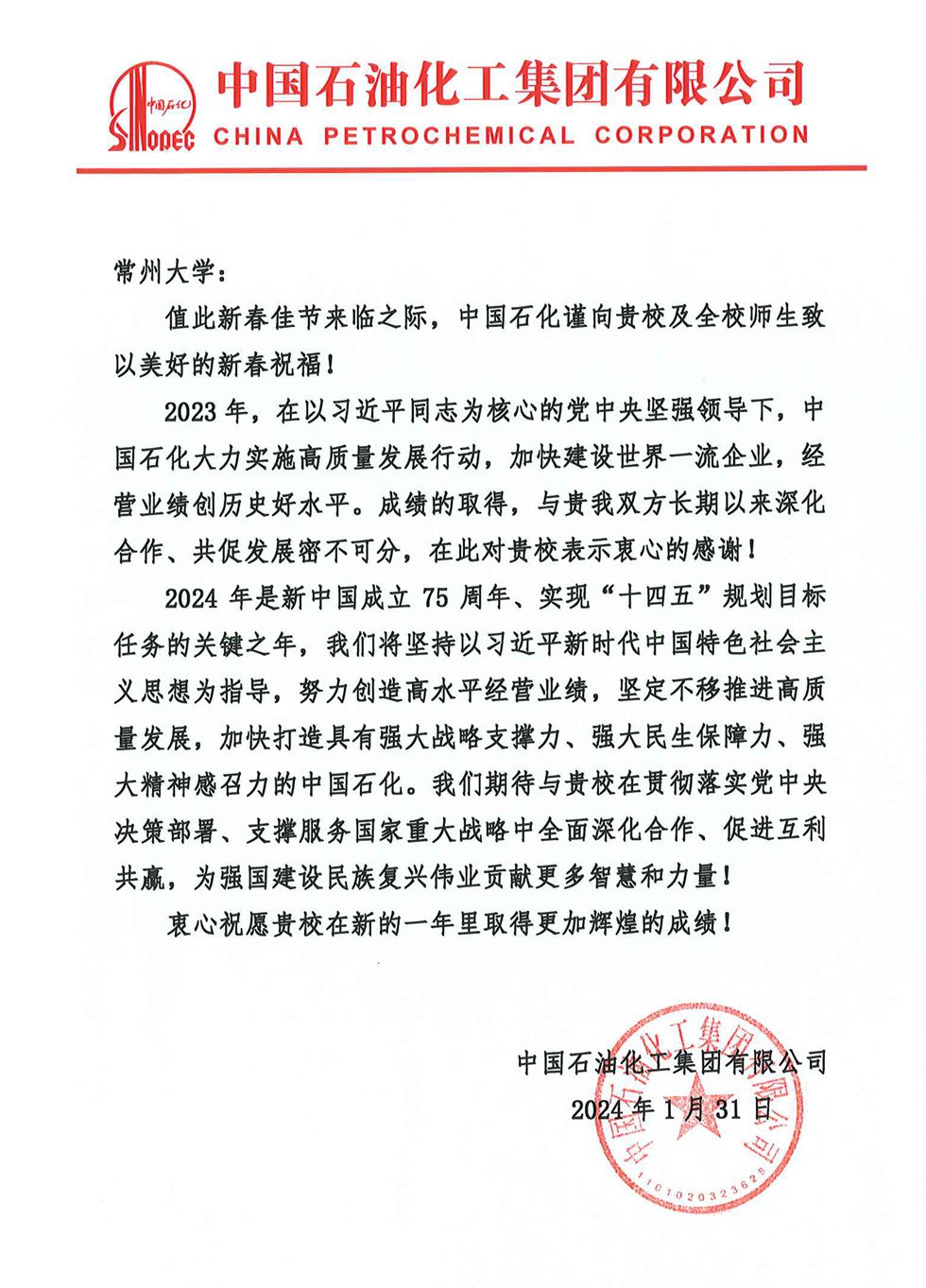 中国石油化工集团有限公司向我校发来新春贺函