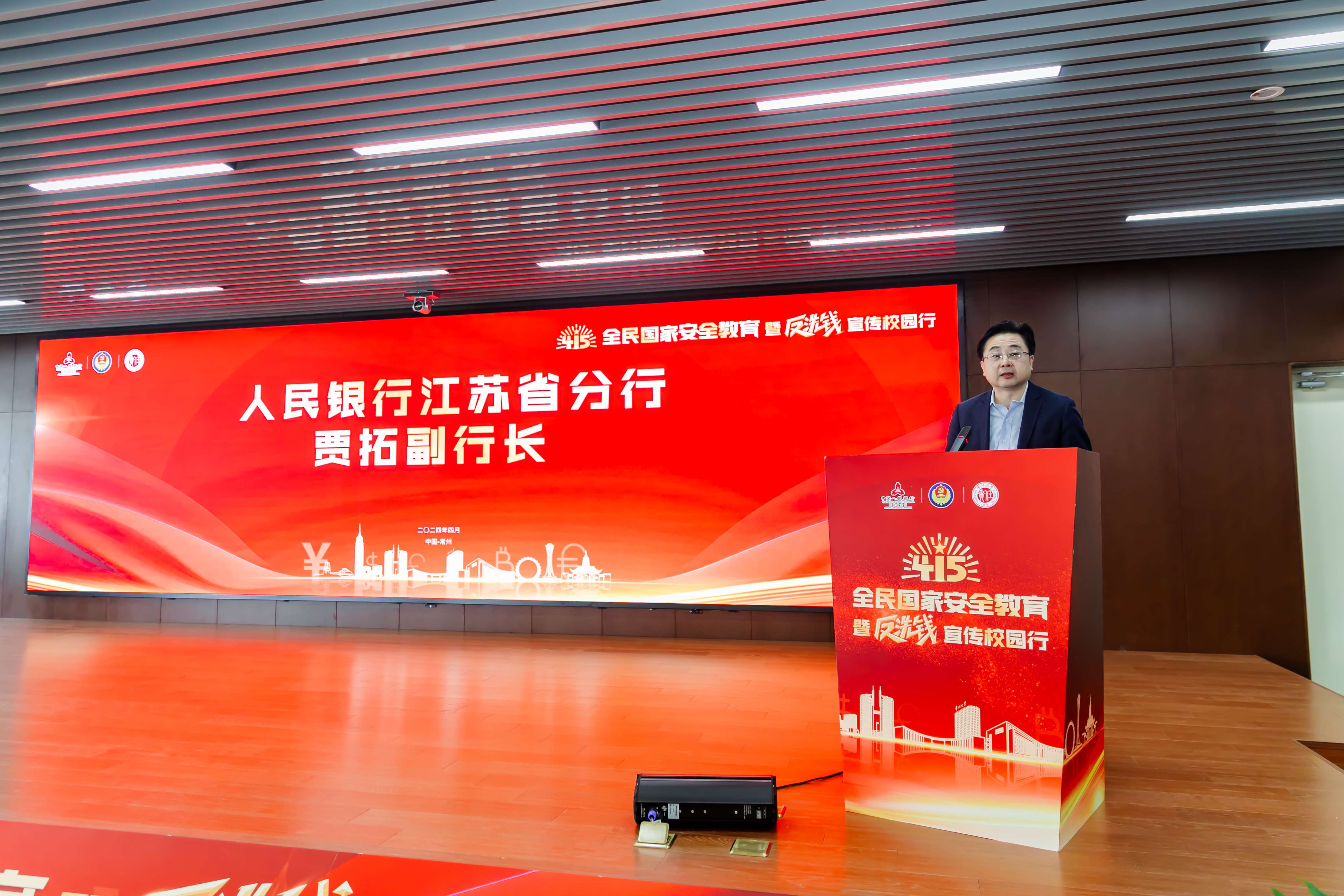 4月15日下午,“4.15全民国家安全教育暨反洗钱宣传校园行”活动在常州市反洗钱宣传教育基地常州大学西太湖校区白云楼报告厅举行。中国人民银行江苏省分行、江苏省国家安全厅、中国人民银行常州市分行、常州市国家安全局、邮政储蓄银行常州市分行、常州市部分银行、证券、保险机构的相关领导应邀出席,常州大学党委副书记、校长陈海群,宣传部、校长办公室、计划财务处、安全保卫处、西太湖校区管委会相关负责人及吴敬琏经济学院师生代表200余人参加活动。