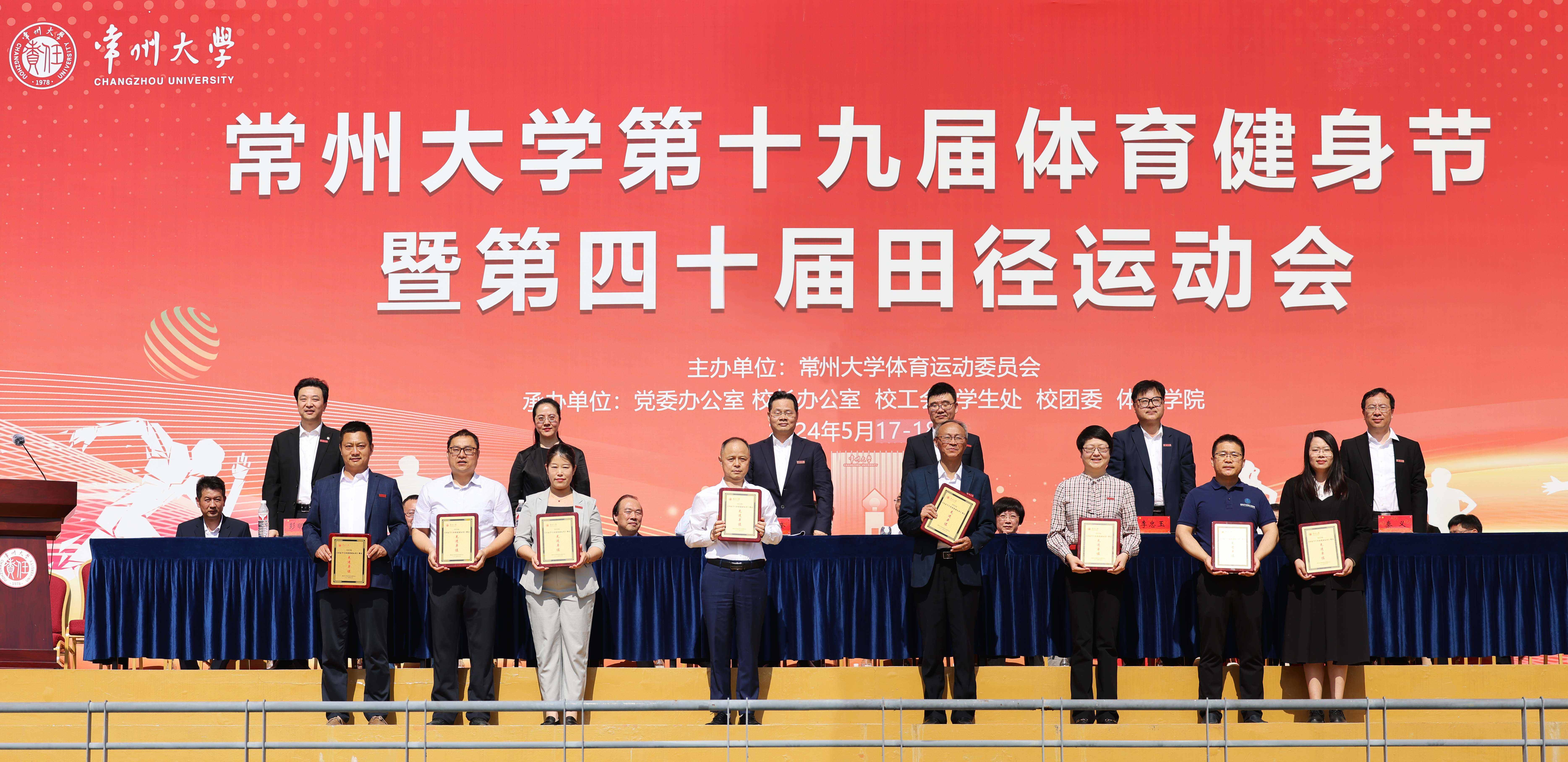王建浦宣读《常州大学2022-2023学年“校长杯”体育工作先进单位》《常州大学2023年度学生体质健康测试先进单位》的表彰文件,校领导分别为获奖单位颁奖。