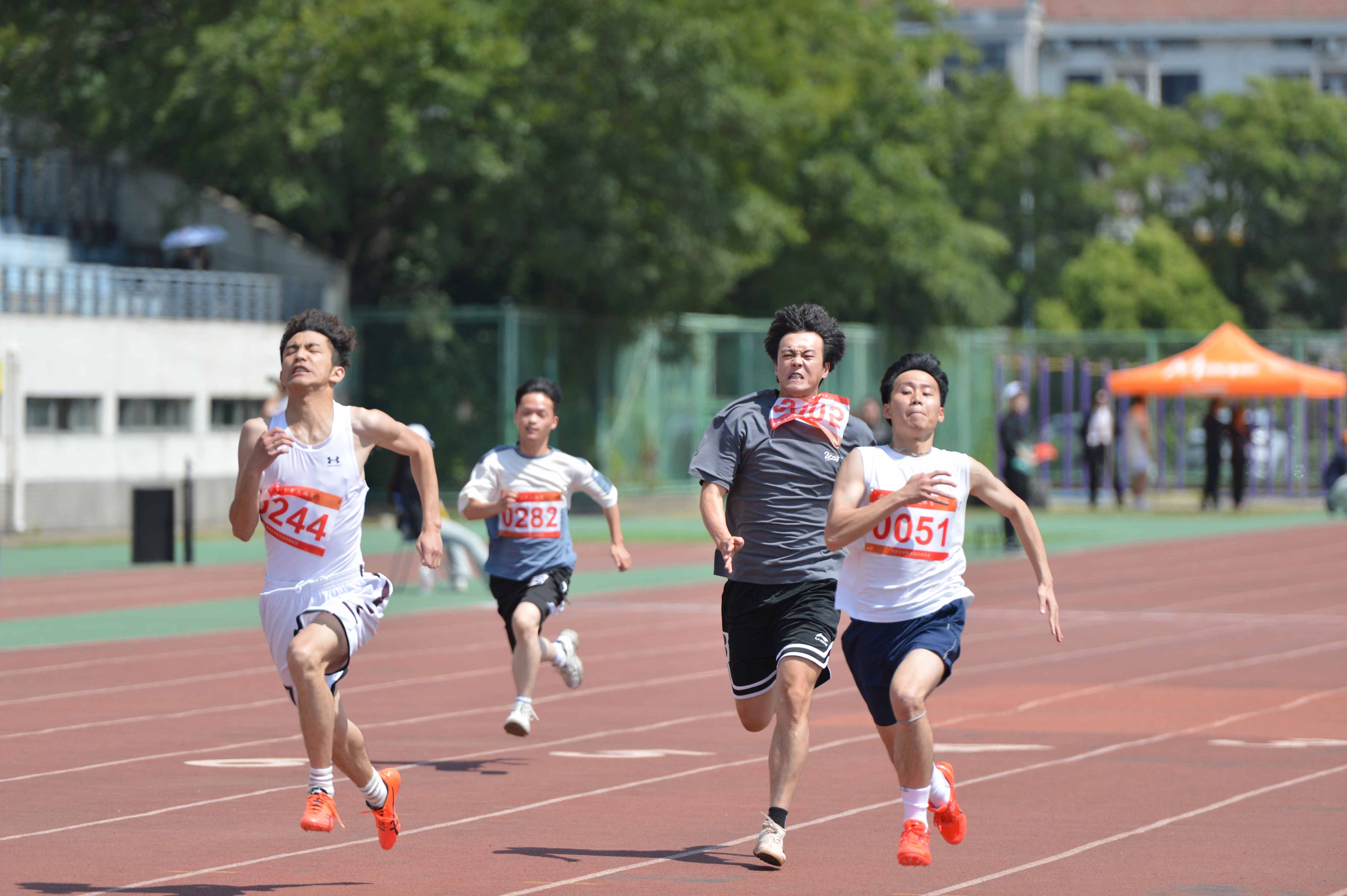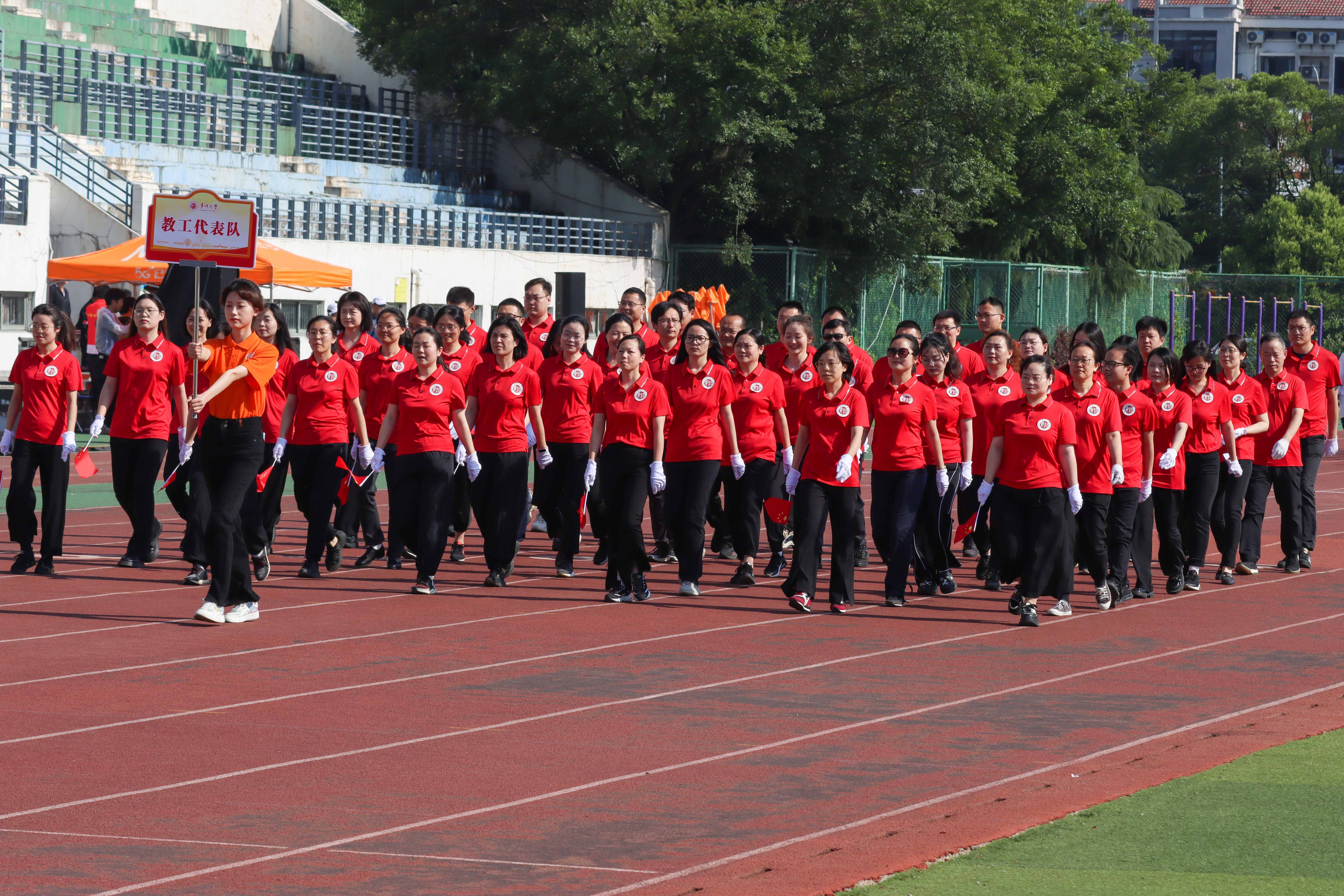 伴随着激昂的运动员进行曲,国旗、校旗、彩旗、鲜花、裁判员、运动员等各个方队迈着有力的步伐,喊着响亮的口号,以饱满的精神状态依次通过主席台。随后,在庄严的国歌声中,全体人员面向国旗,行注目礼,唱中华人民共和国国歌,举行升国旗仪式。