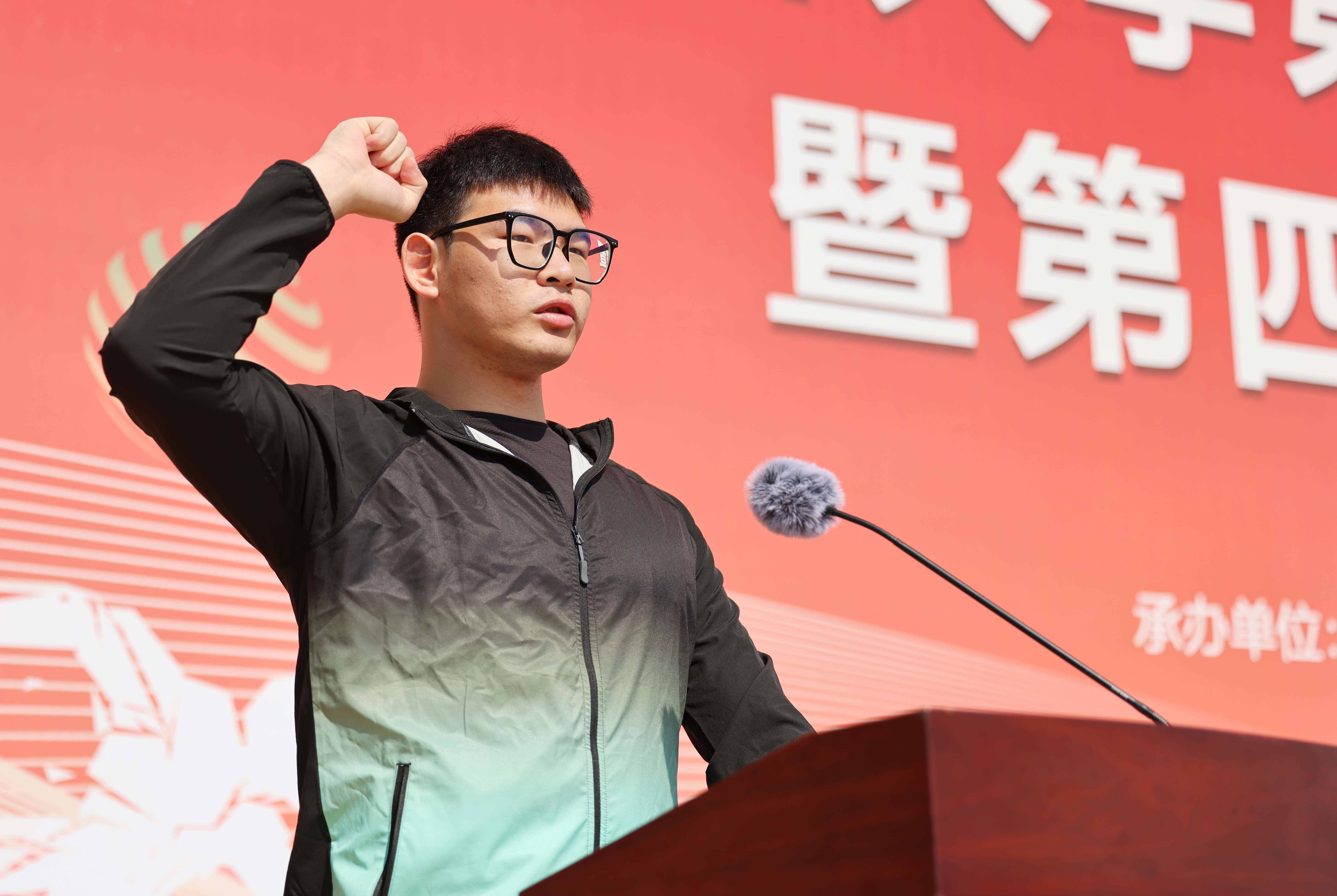 美术与设计学院高俊杰同学代表运动员宣誓,体育学院赵珊老师代表裁判员宣誓。