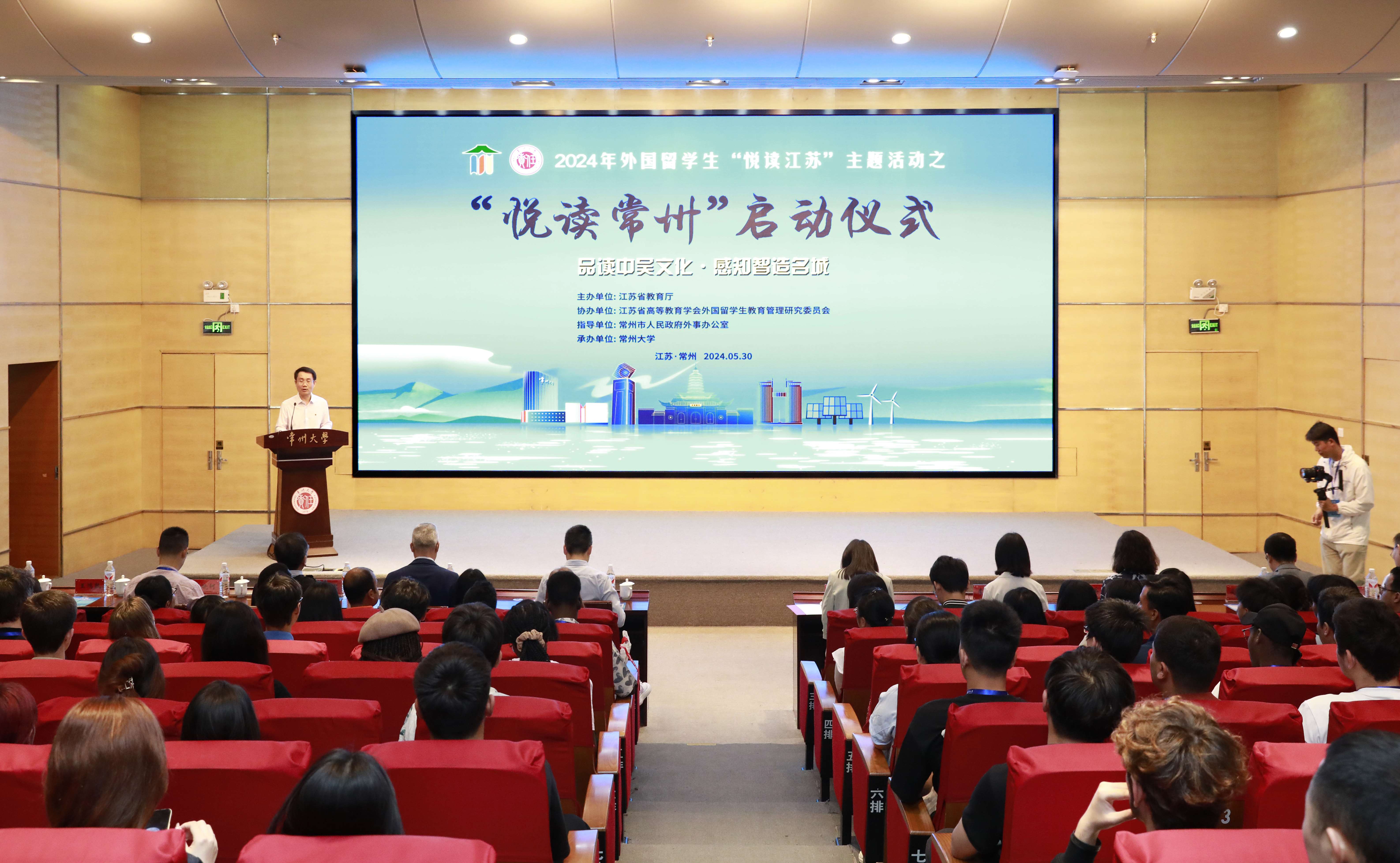 5月30日,由江苏省教育厅主办,江苏省高教学会外国留学生教育管理研究委员会协办,常州市人民政府外事办公室指导,常州大学承办的2024年外国留学生“悦读江苏”主题活动之“悦读常州”在常州举行。活动以“品读中吴文化,感知智造名城”为主题,来自省内28所兄弟院校的30余名教师代表,以及来自俄罗斯、巴基斯坦、孟加拉国、老挝、加纳等32个国家的100余名留学生代表踊跃参加。省教育厅对外合作与交流处处长施蕴玉、四级调研员李勤径,常州市人民政府外事办公室副主任沈炼,省高教学会外国留学生教育管理研究委员会副理事长兼秘书长张海军,常州大学副校长王建浦出席启动仪式。