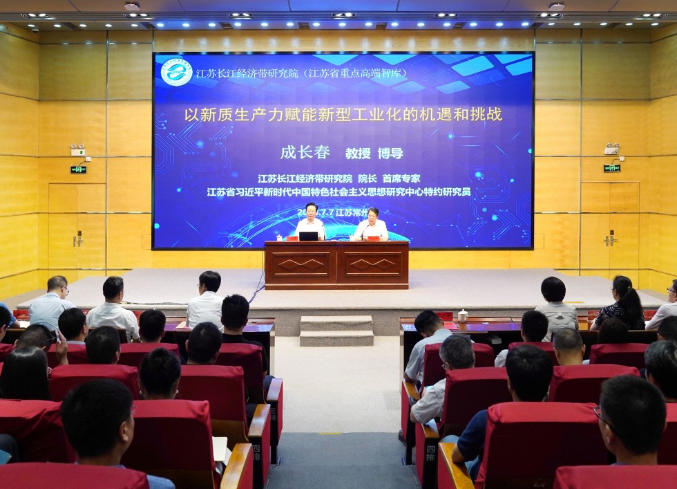 7月7日下午,我校在科教城校区文彰楼报告厅举行专题辅导报告会。南通大学原党委书记,江苏长江经济带研究院院长、首席专家,江苏省习近平新时代中国特色社会主义思想研究中心特约研究员成长春教授应邀作《以新质生产力赋能新型工业化的机遇和挑战》辅导报告。校领导、中层干部、高级职称教师代表200余人参加了报告会。报告会由党委书记徐守坤主持。