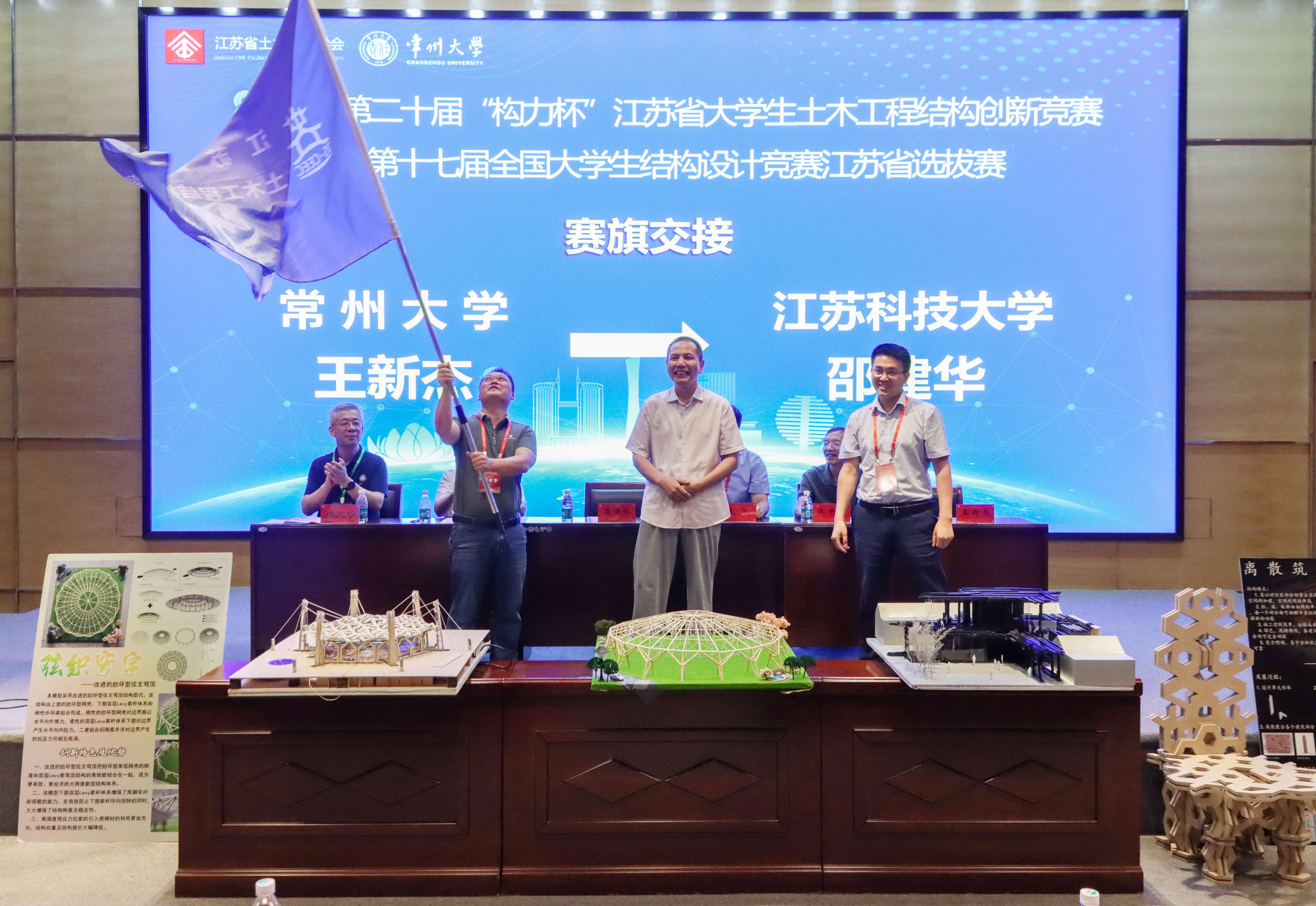 吕恒林作总结指导。他表示,本届大赛充分展现了新时代大学生的结构创新意识和工程实践能力,各高校应当保持高度的专业自信,共同推动我国土木工程绿色化、工业化和智能化发展,共同促进我国土木工程向深地、深海、深空进发。吕恒林主持交旗仪式,将赛旗交予下一届承办单位江苏科技大学,江苏科技大学土木工程与建筑学院邵建华教授接旗。