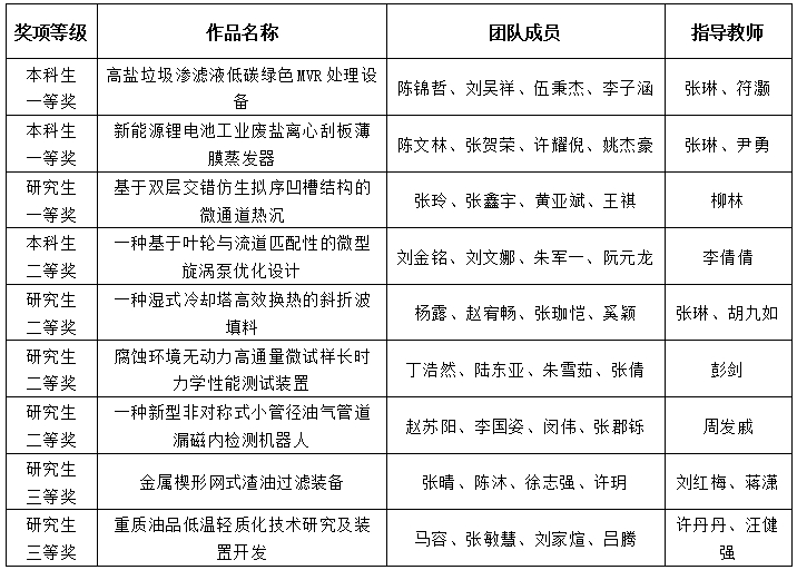 陈文林、张贺荣、许耀倪、姚杰豪的作品《新能源锂电池工业废盐离心刮板薄膜蒸发器》,陈锦哲、刘吴祥、伍秉杰、李子涵的作品《高盐垃圾渗滤液低碳绿色MVR处理设备》获本科生组一等奖。张玲、张鑫宇、黄亚斌、王祺的作品《基于双层交错仿生拟序凹槽结构的微通道热沉》获研究生组一等奖。同时,学校获二等奖4项、三等奖2项。