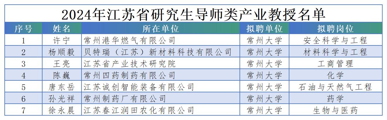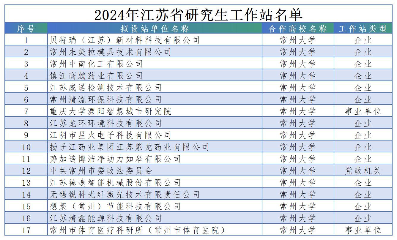 近日,江苏省教育厅公布2024年江苏省研究生工作站评选结果,我校申报的“贝特瑞(江苏)新材料科技有限公司”等17个工作站获批立项建设,获批数量位居全省第一。同时,省教育厅公布了2024年江苏省研究生导师类产业教授(兼职)选聘结果,我校推荐的许宁等7人成功获批为江苏省研究生导师类产业教授。