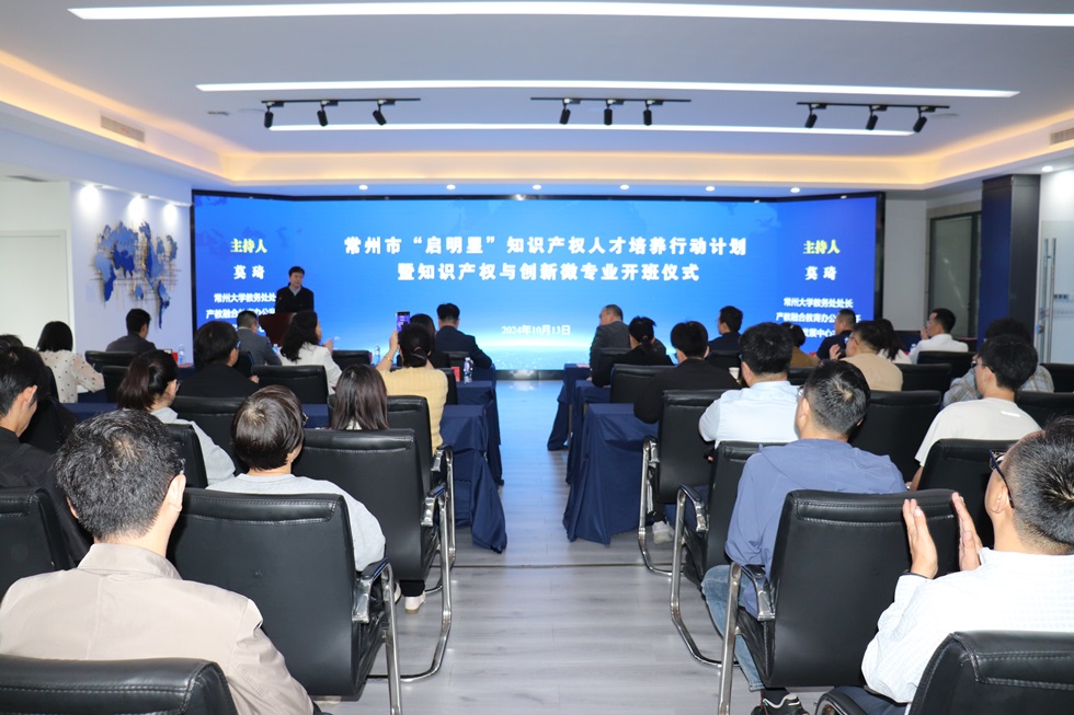 10月13日上午,由常州市市场监督管理局(知识产权局)主办,常州市知识产权保护中心、常州大学承办,常州市知识产权协会协办的常州市“启明星”知识产权人才培养行动计划暨知识产权与创新微专业开班仪式在科教城现代工业中心206双创路演大厅举行。常州大学党委常委、副校长李忠玉,常州市市场监督管理局(知识产权局)党组成员、知识产权局副局长丁青峰,常州市知识产权规划发展处副处长魏金,常州市知识产权协会理事长、常州中德产业创新与合作中心董事长唐赛,常州市知识产权协会秘书长、常州中德产业创新与合作中心副总经理刘勇军出席开班仪式,教务处、创新创业学院、江苏省技术转移(常州大学)研究院相关负责人,知识产权与微专业全体师生参加开班仪式。