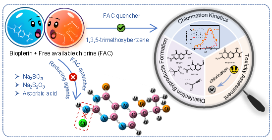 近日,彭明国教授团队左延婷博士鉴定识别出一类在含藻水中广泛赋存的高含氮杂环类小分子——蝶呤类化合物,并以典型的生物蝶呤作为研究对象,系统探究了其在氯化过程中的动力学、消毒副产物形成和毒性效应。研究发现淬灭剂的选择与使用对于生物蝶呤氯化过程的研究具有重要影响,传统还原性氯淬灭剂(硫代硫酸钠、亚硫酸钠、抗坏血酸)均会破坏生物蝶呤氯化形成的N-Cl键,从而严重低估此类化合物与活性氯的反应活性。研究验证了醚类化合物1,3,5-三甲氧基苯作为替代性氯淬灭剂的可行性,并成功揭示了pH依赖的生物蝶呤-氯反应动力学机制,同时结合高分辨质谱和DFT理论计算首次鉴定出一系列与含氮蝶啶环相关的N-Cl转化产物,并基于理论预测和发光菌急性毒性测试评价了转化产物的毒性效应。研究结果为蝶呤类化合物在氯消毒过程中的潜在风险提供了科学依据,并为准确研究新兴含氮化合物的氯化过程提供了参考。