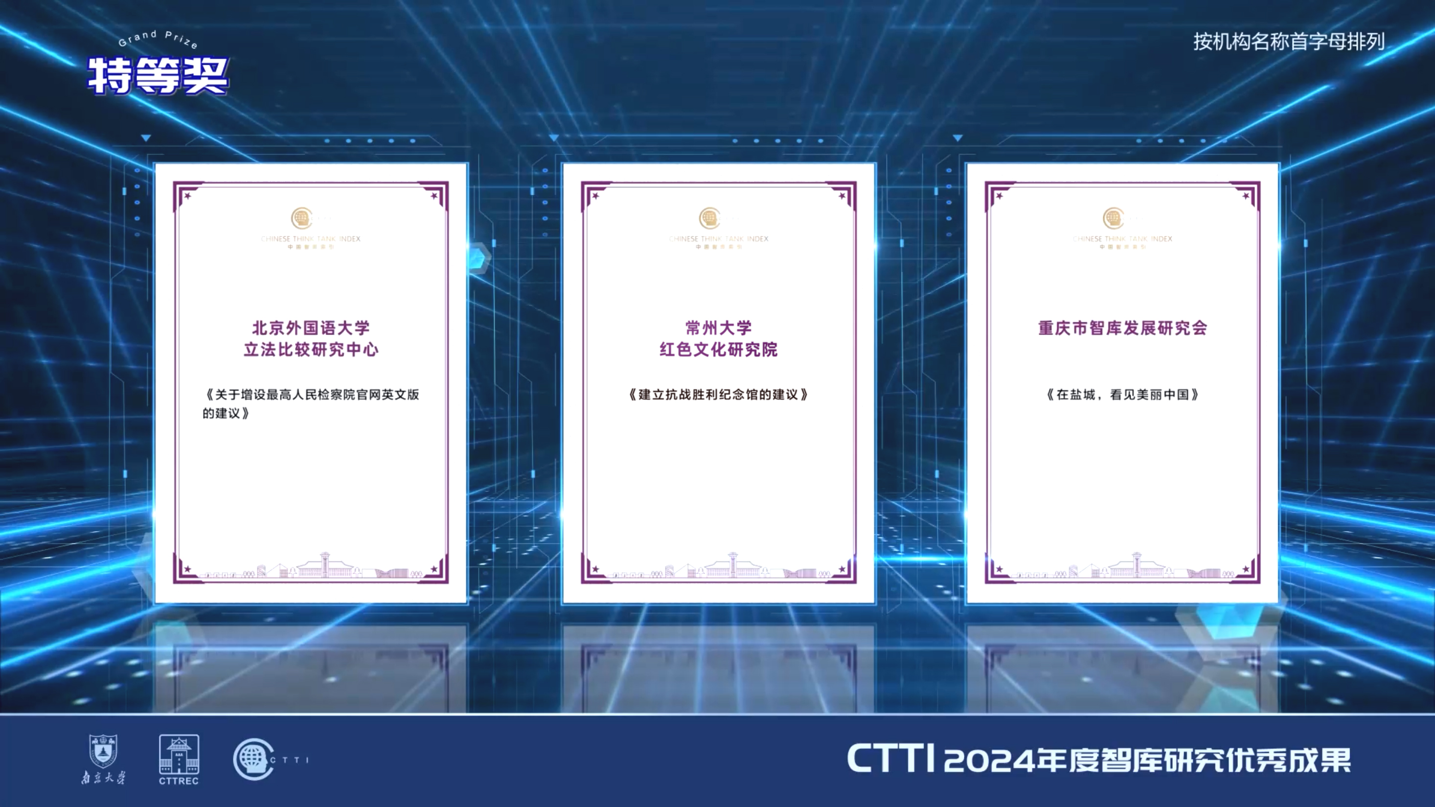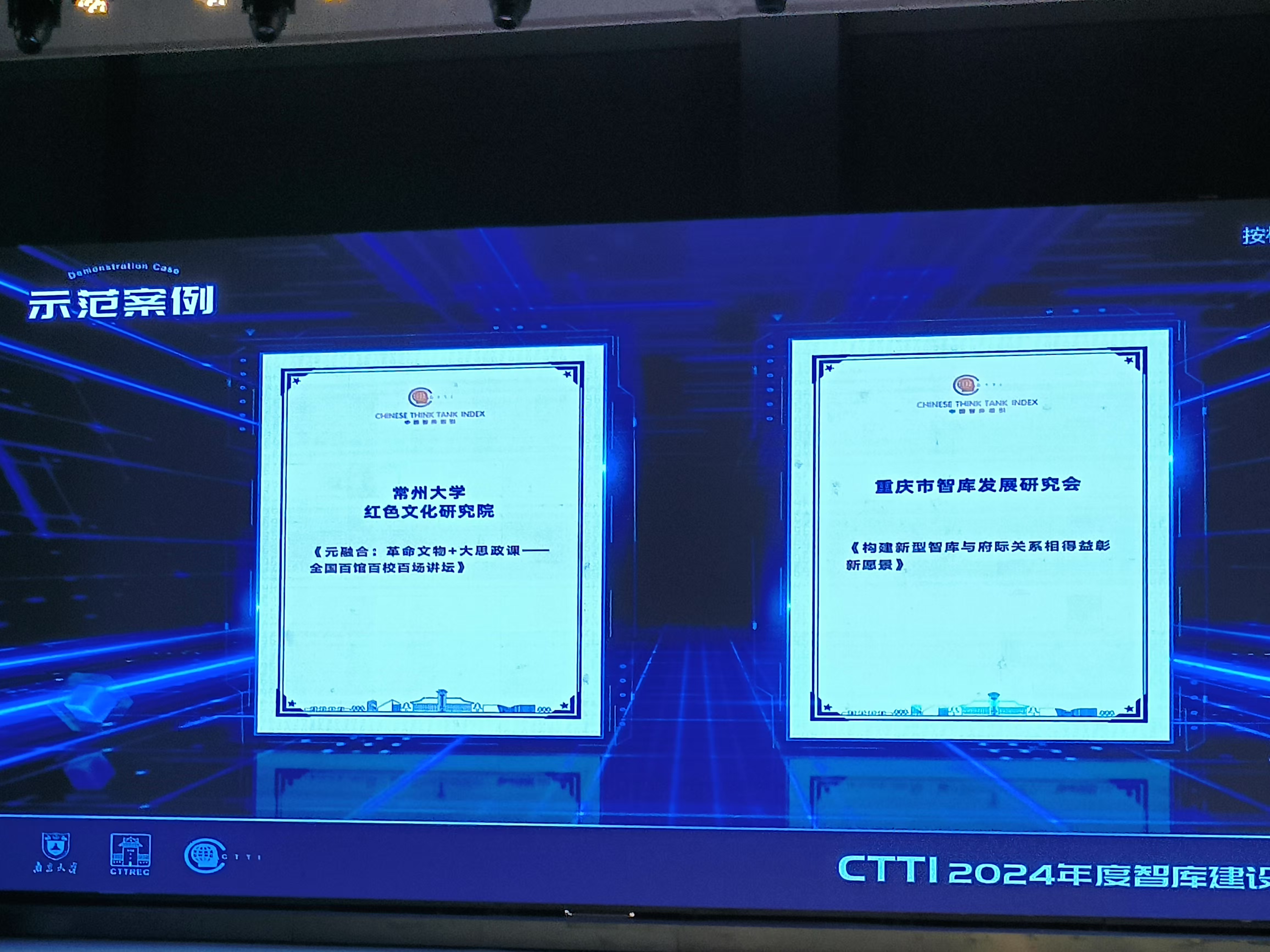 11月30日,在兰州大学举办的2024年度新型智库治理论坛上,江苏省重点培育智库——常州大学红色文化研究院入选CTTI来源智库名单,并获得2024年度智库研究优秀成果特等奖和智库建设示范案例两项奖励。