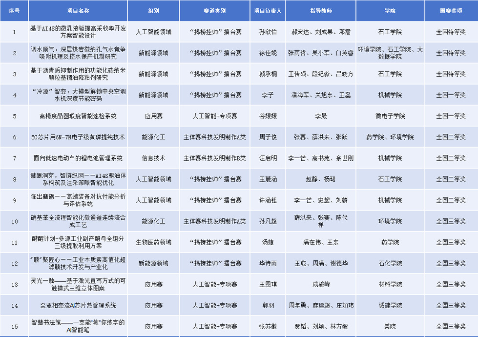 学校于2024年10月底启动“挑战杯”竞赛校内选拔工作。校党委高度重视大赛备战工作,校党委副书记黄海燕统筹推进赛事组织工作,多次慰问参赛师生并赴“揭榜挂帅”擂台赛人工智能领域擂台赛国赛现场给予指导。在相关职能部门和各学院的大力支持下,校团委统一部署,广泛动员师生,组织了校级初赛、复赛、决赛及省赛推报项目选拔赛,专家一对一辅导,模拟答辩,赛事规则解读会等系列活动,努力培养和提升广大青年学生的创新意识、创业精神和实践能力。参赛师生围绕能源化工、信息技术、人工智能等领域,潜心打磨作品,勇挑创新大梁,为比赛取得优异成绩打下了坚实的基础,展现了我校师生砥砺奋进、勇于创新的进取精神。特等奖获得者、Y2403环境工程3班徐佳妮等同学表示,几百个日夜的坚守,不仅是作品日臻完善的过程,更是成长的见证。一等奖获得者、集成电路231班谷媛媛等同学认为,在“挑战杯”的备赛过程中,收获的不仅是荣誉,更是创新的精神、挑战的精神,将以此为新的起点,不忘初心,砥砺前行!