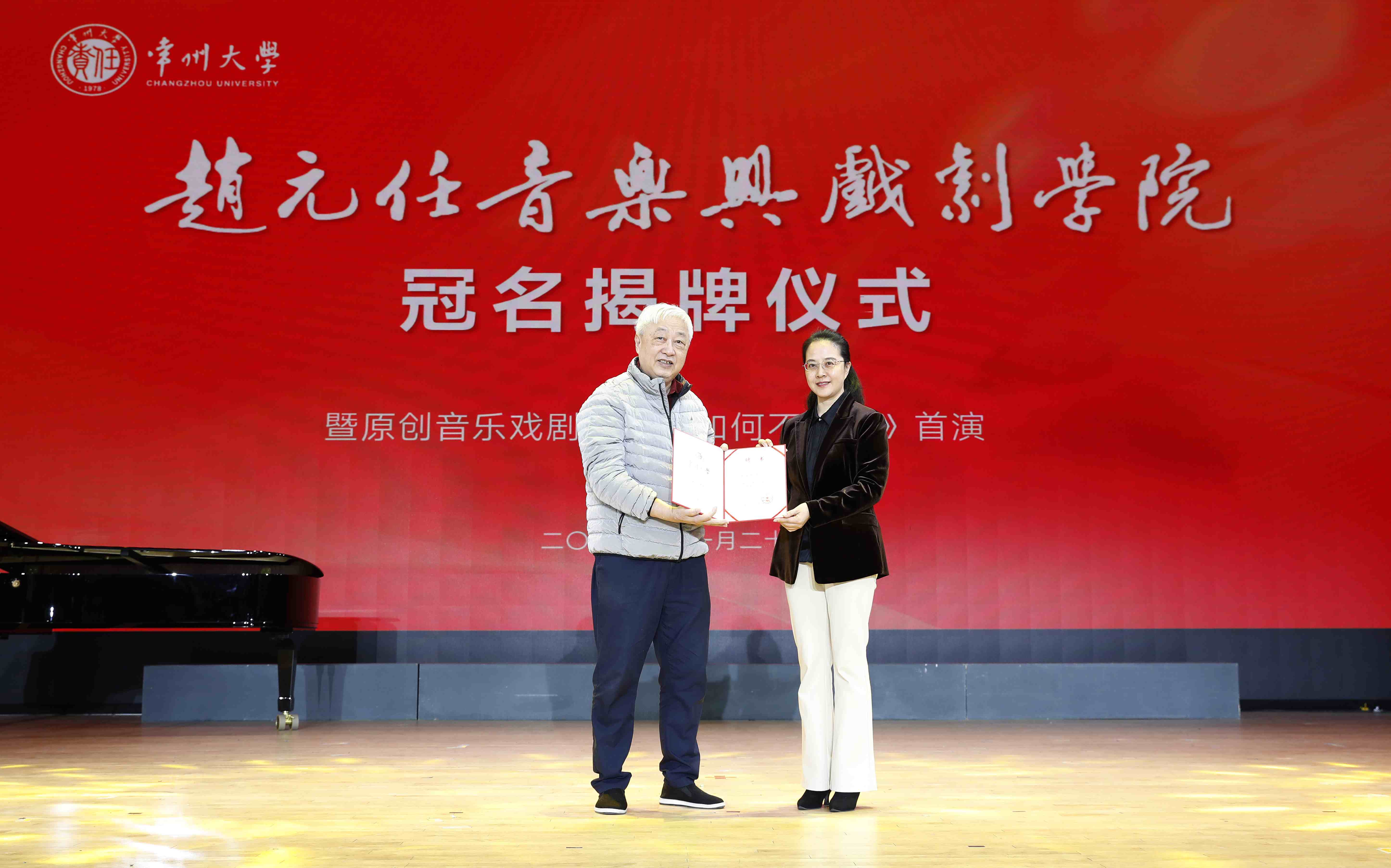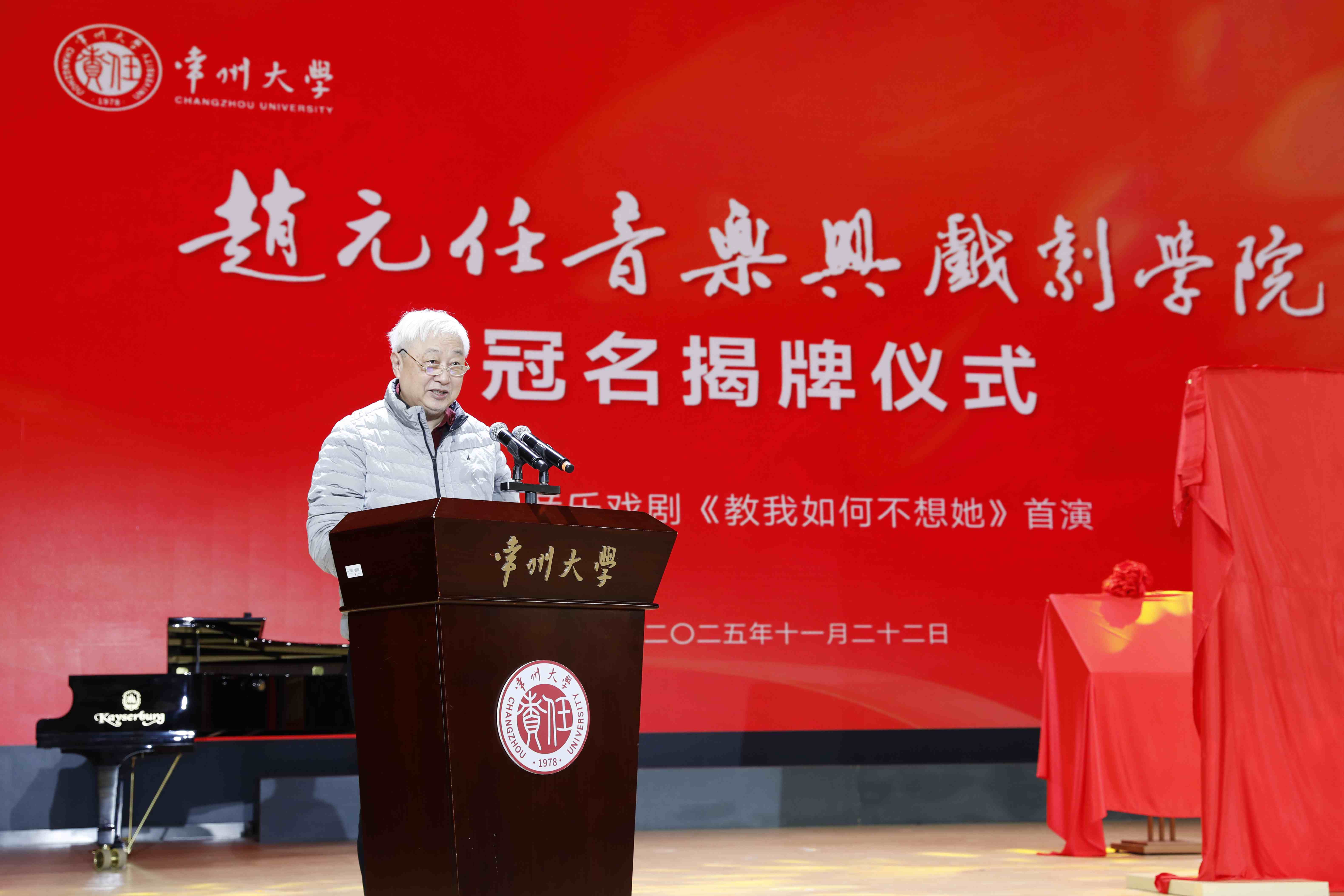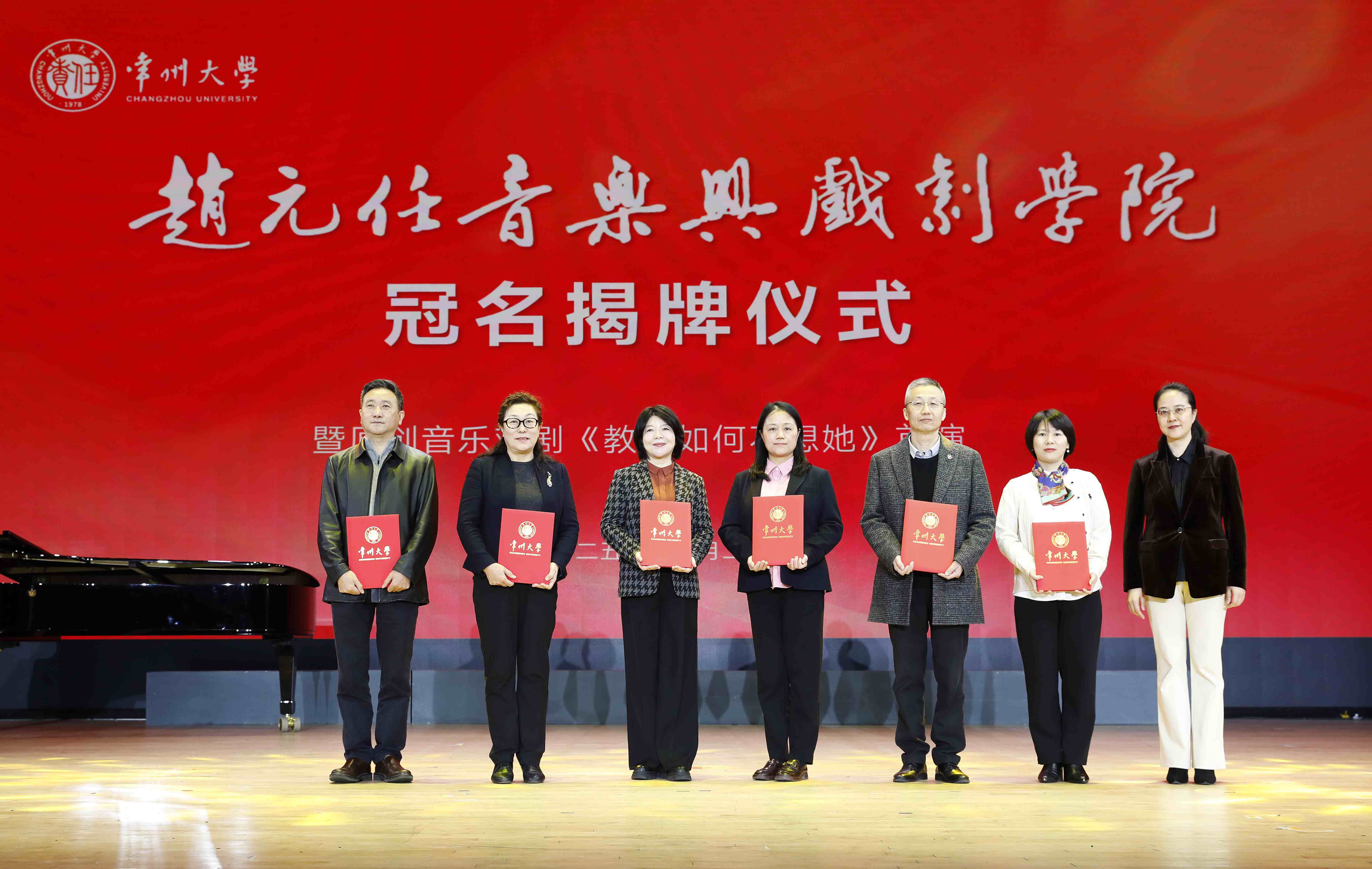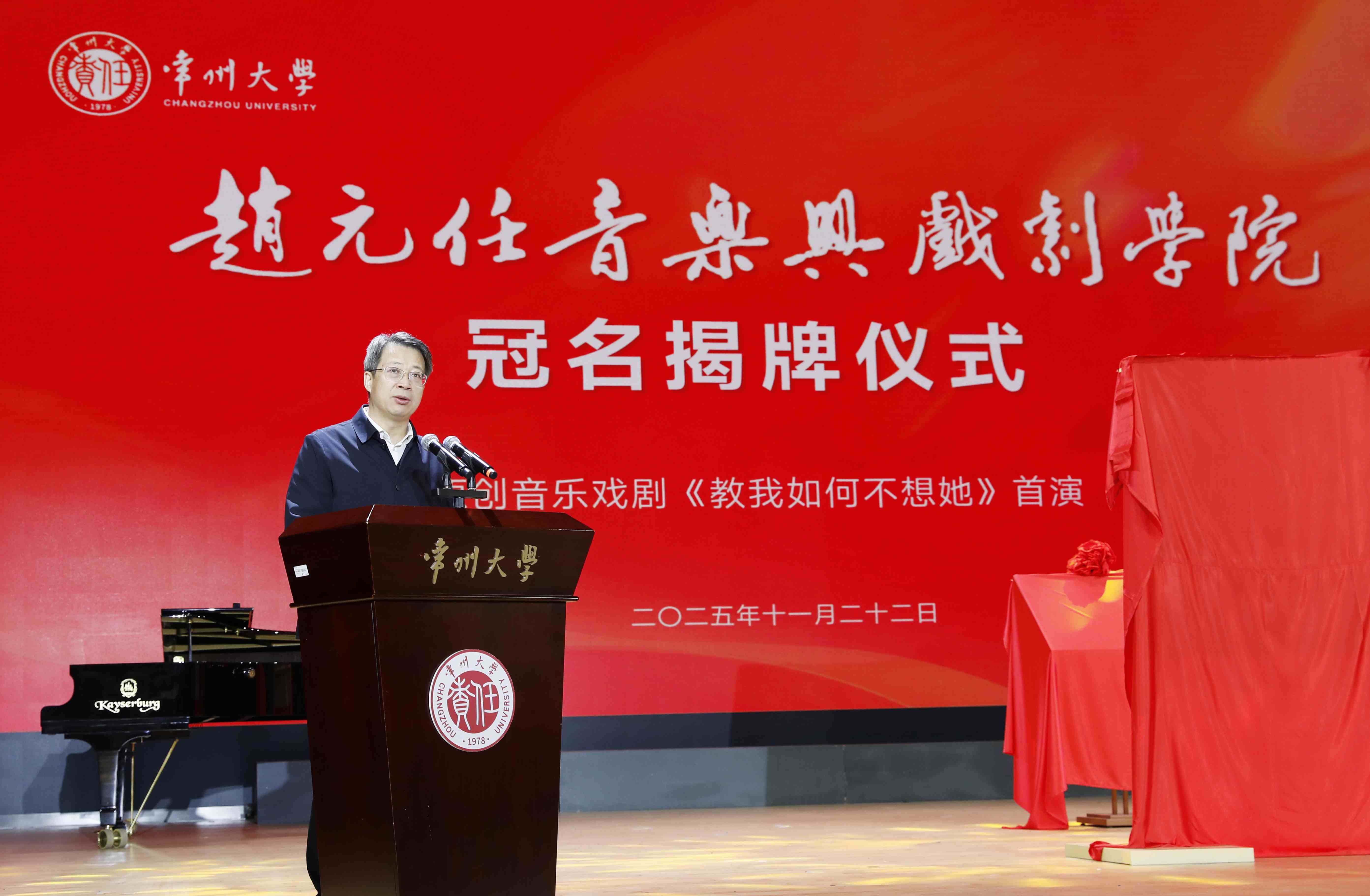 11月22日,赵元任音乐与戏剧学院冠名揭牌仪式暨原创音乐戏剧《教我如何不想她》首演在西太湖校区立艺楼礼堂举行。赵元任先生外孙黄家林教授,常州市委常委、宣传部部长陈志良,江苏省教育厅体育卫生与艺术教育处二级调研员王红蕾,清华大学艺术教育中心主任赵洪,常州市委宣传部副部长谢春林,常州市文学艺术界联合会党组书记、主席沈玉俊,常州市委宣传部办公室主任魏火军,江苏晋陵文旅发展集团有限公司董事长苏刚,内蒙古自治区教育厅美育指导委员会秘书长张卉,上海市学校体育与艺术发展评估中心常务副主任张欢,常州大学党委书记徐守坤,常州大学党委副书记黄海燕,常州大学党委常委、副校长杨琳出席仪式,常州市和武进区相关部门领导、上海音乐学院及省内兄弟院校音乐学院的领导和专家、学校相关职能部门和相关学院负责人、赵元任音乐与戏剧学院全体师生等齐聚一堂,共同见证这一重要时刻。黄海燕主持仪式。