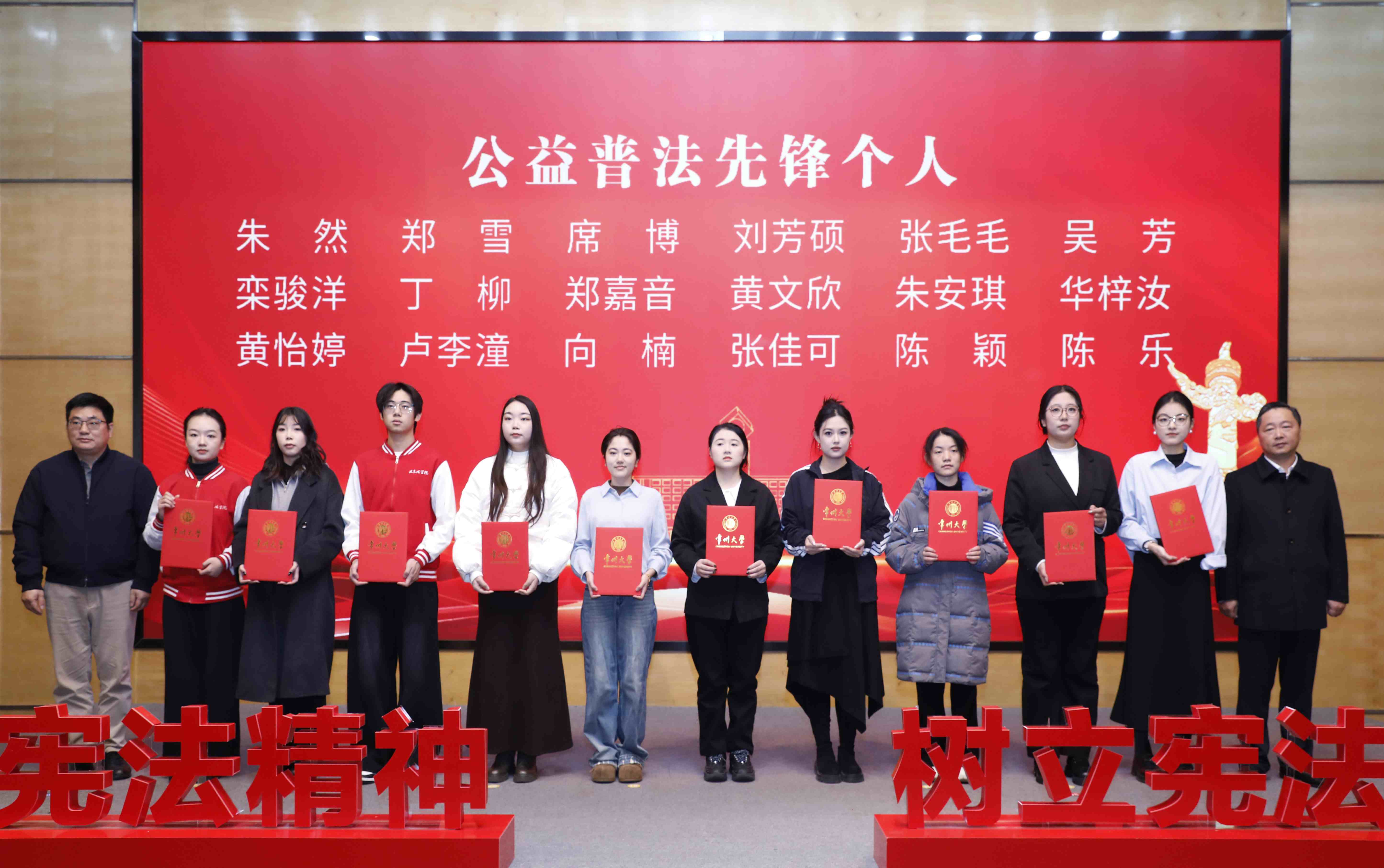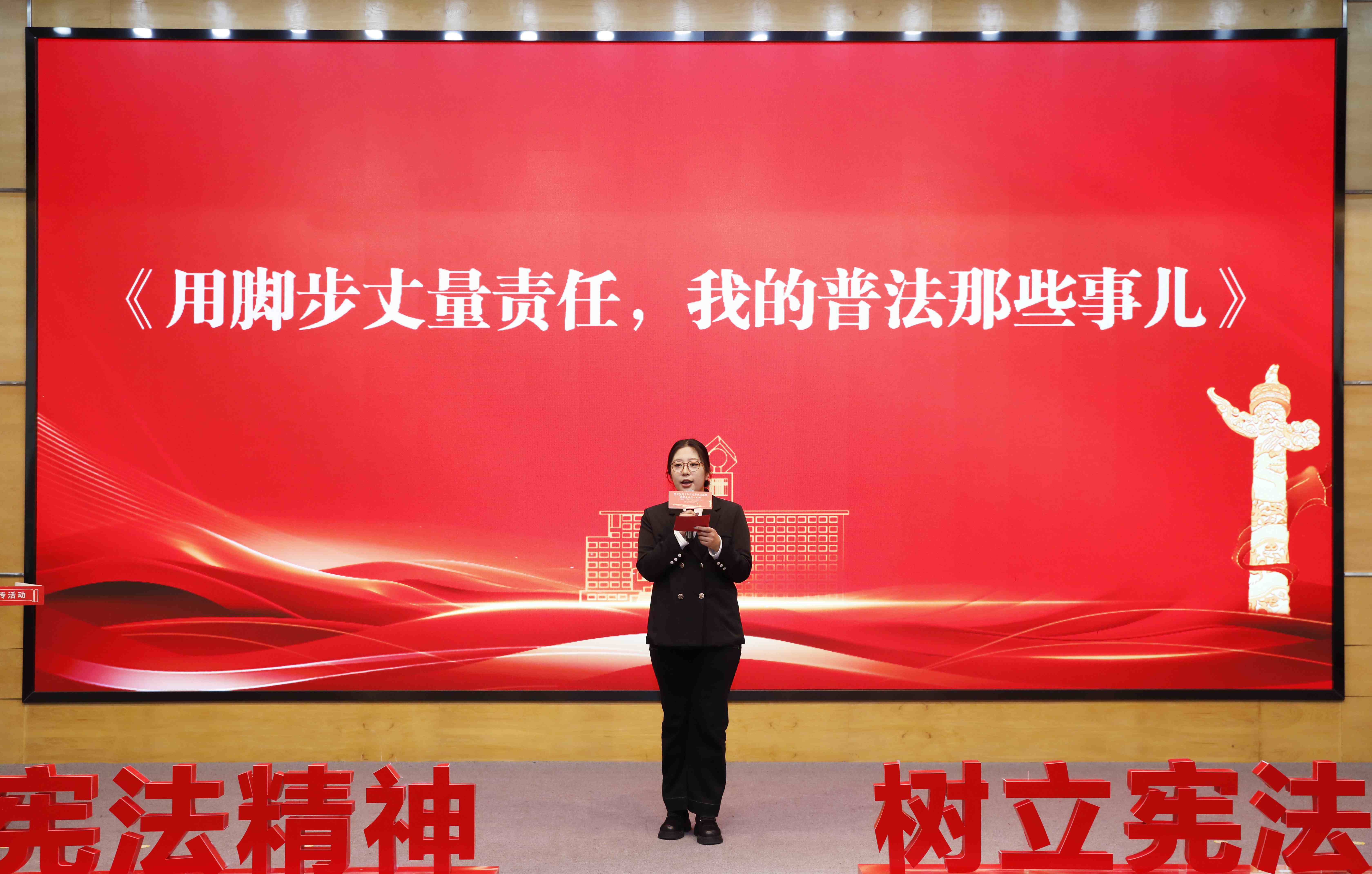 活动现场举行了庄严的宪法宣誓仪式,并对普法工作中的辛勤付出与积极贡献的团队和师生代表进行了表彰。学生代表陈颖现场宣读了《大学生尊法守法倡议书》,呼吁青年学子自觉学习宪法、践行法治,争做社会主义法治的忠实崇尚者和坚定捍卫者。弘道罪错青少年帮教公益中心负责人刘芳硕同学以“用脚步丈量责任,我的普法那些事儿”为题,分享了普法宣传的亲身经历,展现了青年在法治传播中的温度与力量。
