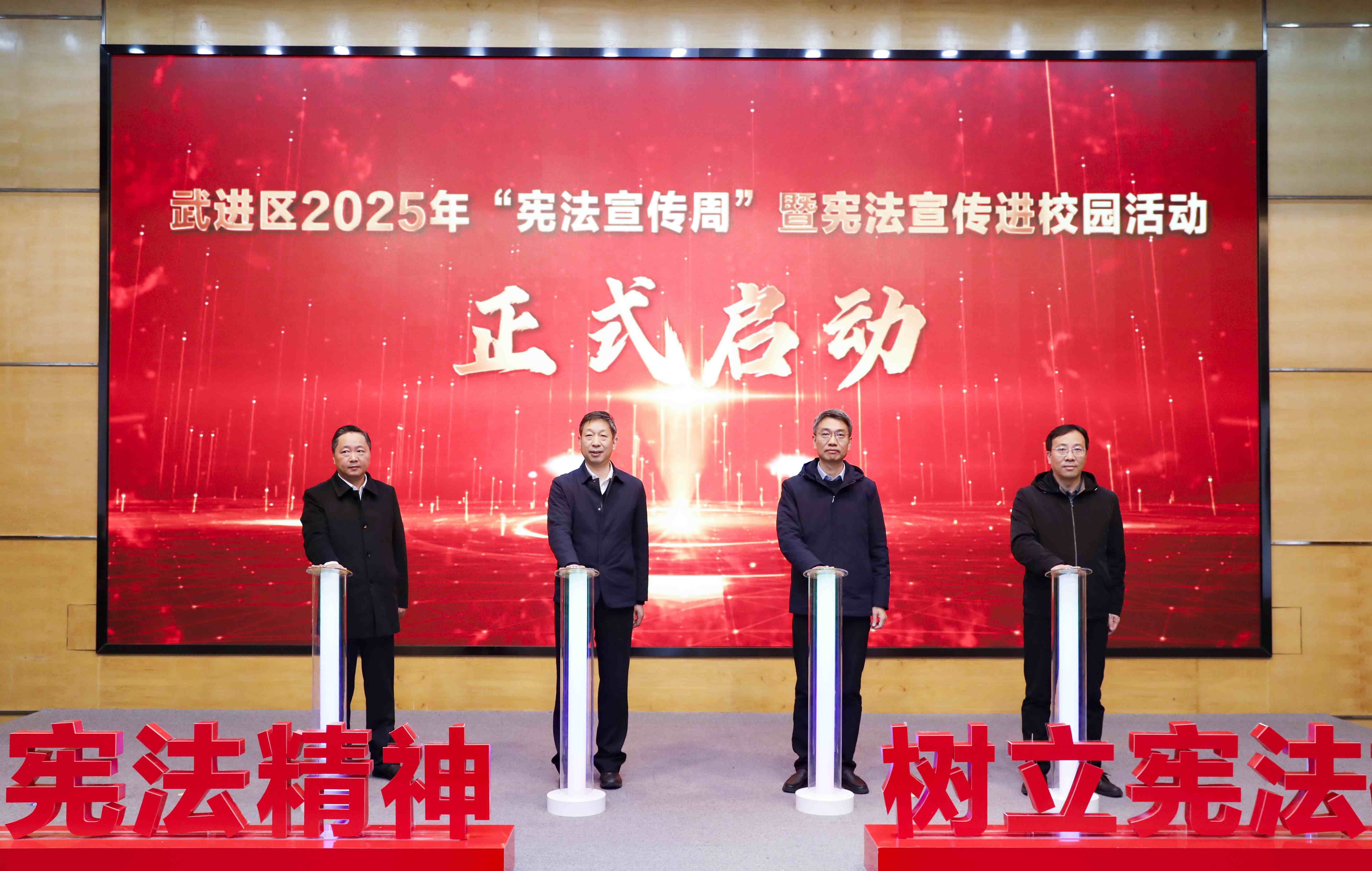 盛世麟、潘勇、秦义、杨红明共同启动“武进区2025年宪法宣传周暨宪法宣传进校园活动”。